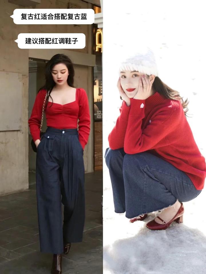 如果你喜歡復古風情濃郁的穿搭,那麼在選擇服裝配色上,更建議大家選擇復古紅與復古藍的組合。復古紅的毛衣,配復古藍的牛仔褲,高級又顯白。