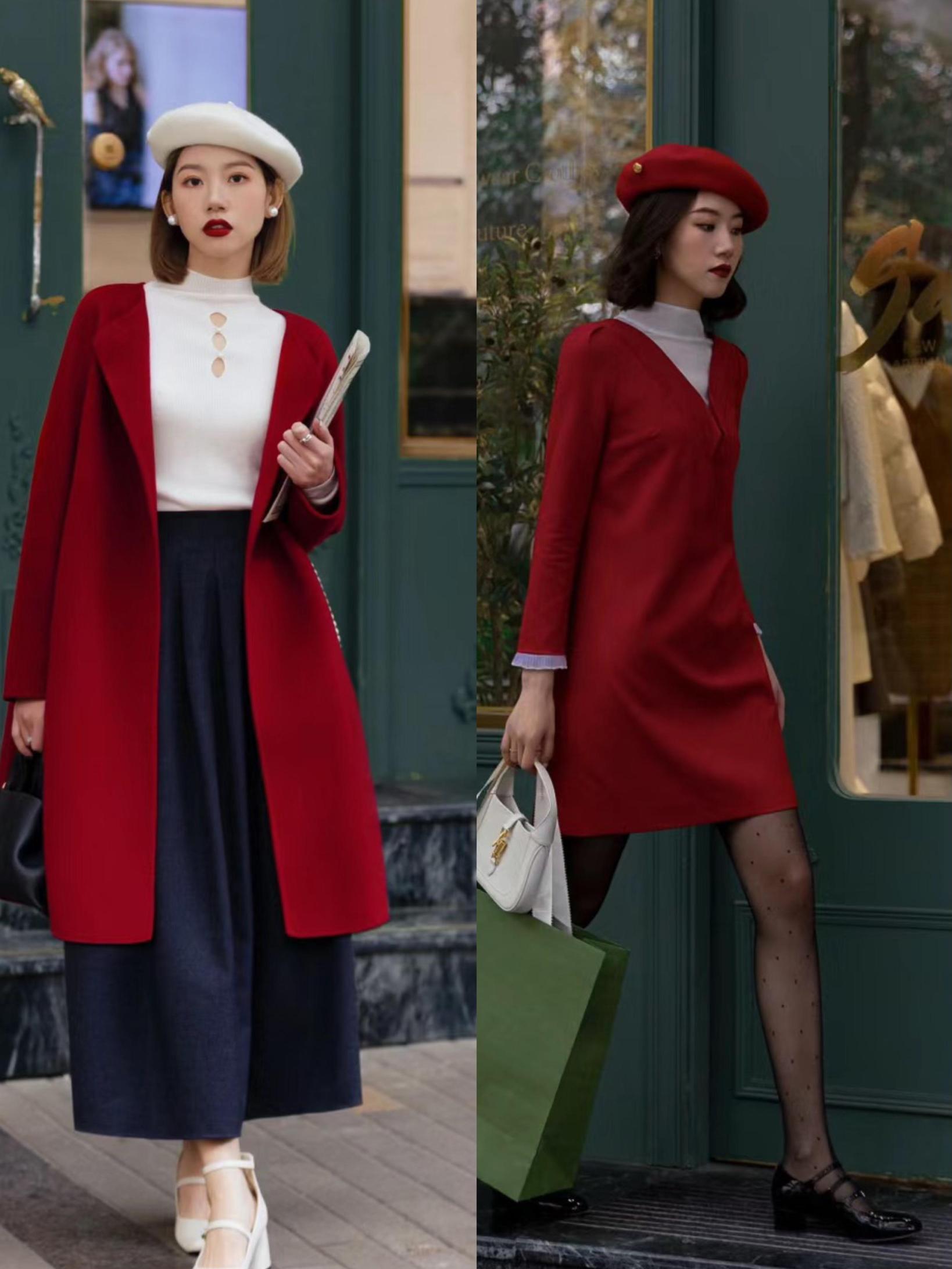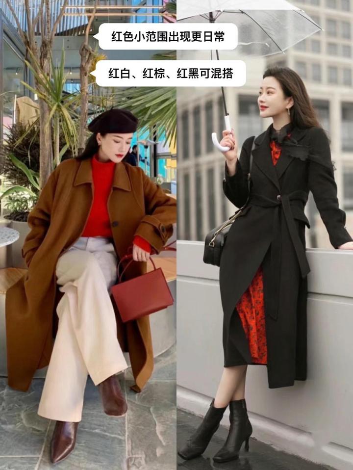 如果擔心自己對於紅色系的駕馭能力沒有那麼強,我們可以嘗試用小面積的紅色組合搭配。比如紅色毛衣或者紅色連衣裙作爲內搭,不會露出大面積的紅色,就精緻時髦。