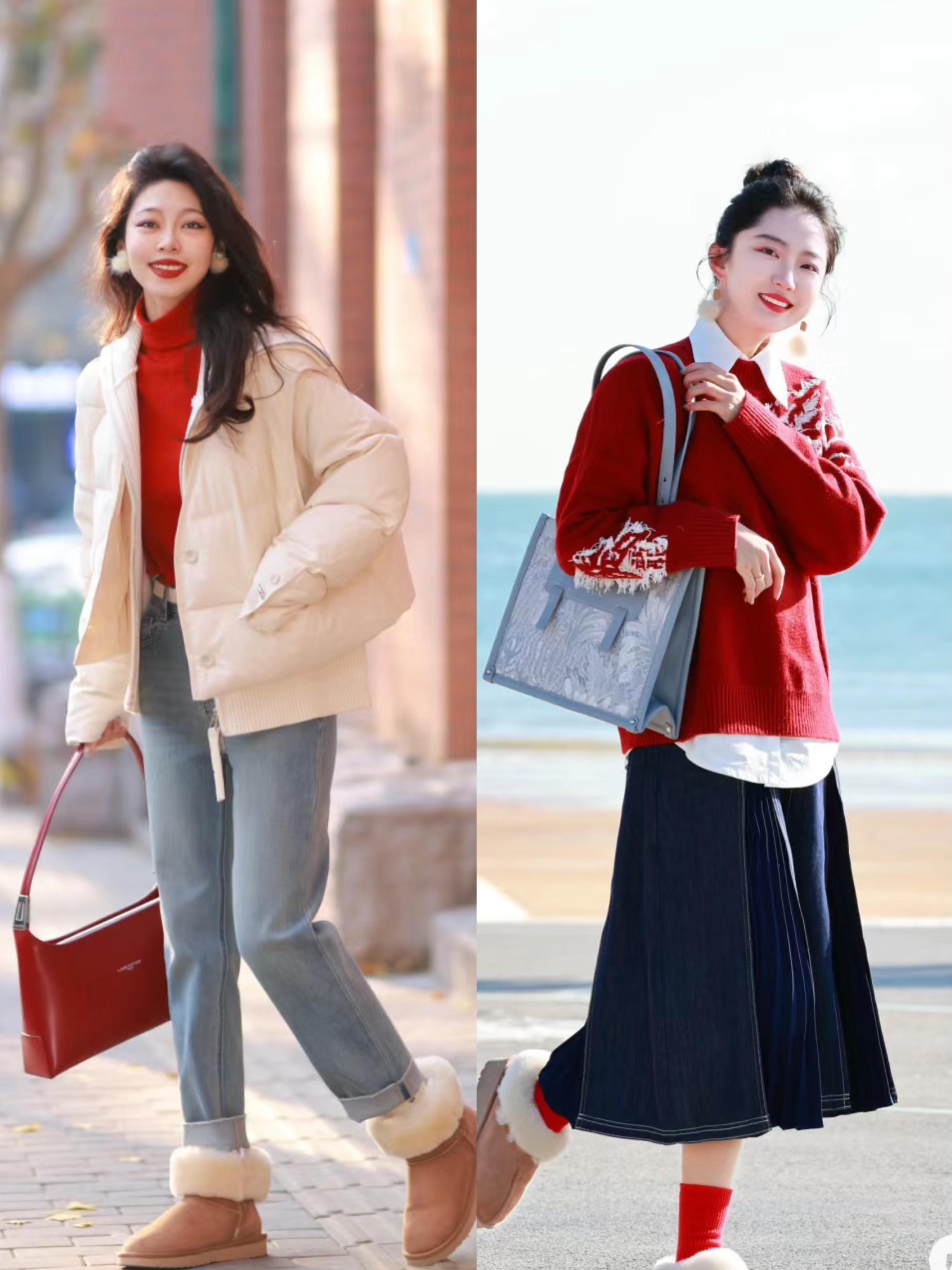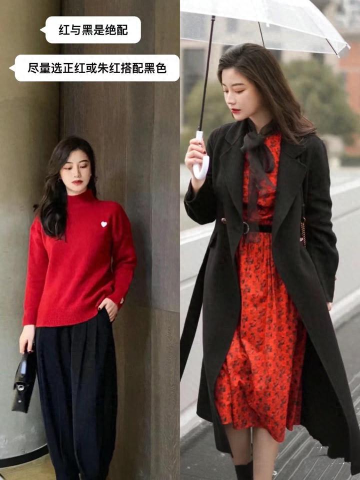 新年穿搭想要豔壓羣芳、高級霸氣,就選擇紅色與黑色的搭配。紅色毛衣配黑色褲子,或者紅色連衣裙配黑色大衣,都具備了獨特的格調美。