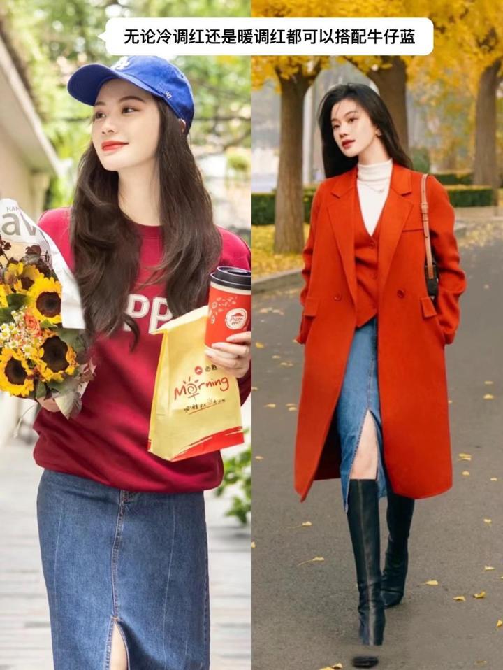 不管是冷調的紅色、還是暖調的紅色,都可以與牛仔色進行搭配。一條開衩設計的牛仔半身裙,呈現出女性的優雅與端莊,時髦又醒目。