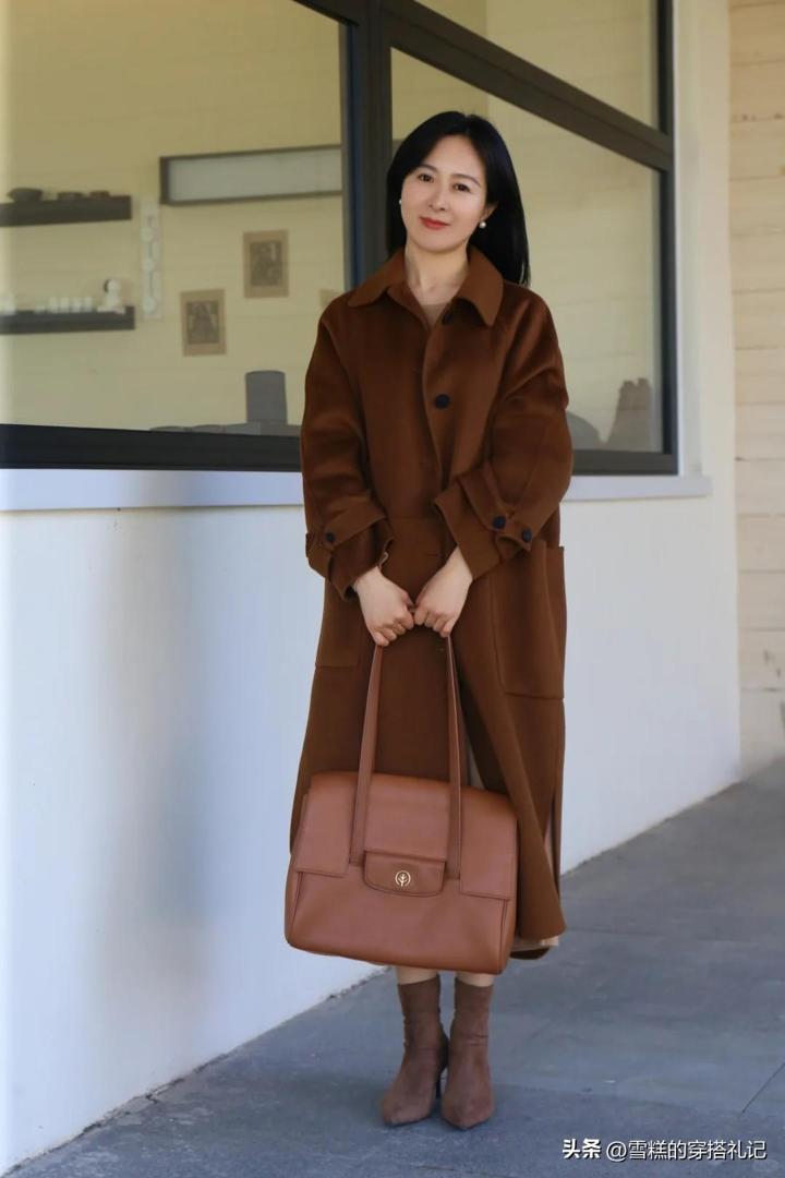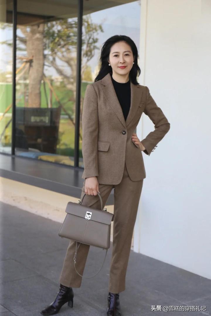 咖色的西裝組合,一改黑白灰系列的沉悶單調味道,爲板正硬挺的服裝注入了更多柔和與溫暖。並且裏面增加了貼膚的黑色內搭,更能配合收腰元素展現咱們中年女人的典雅魅力。