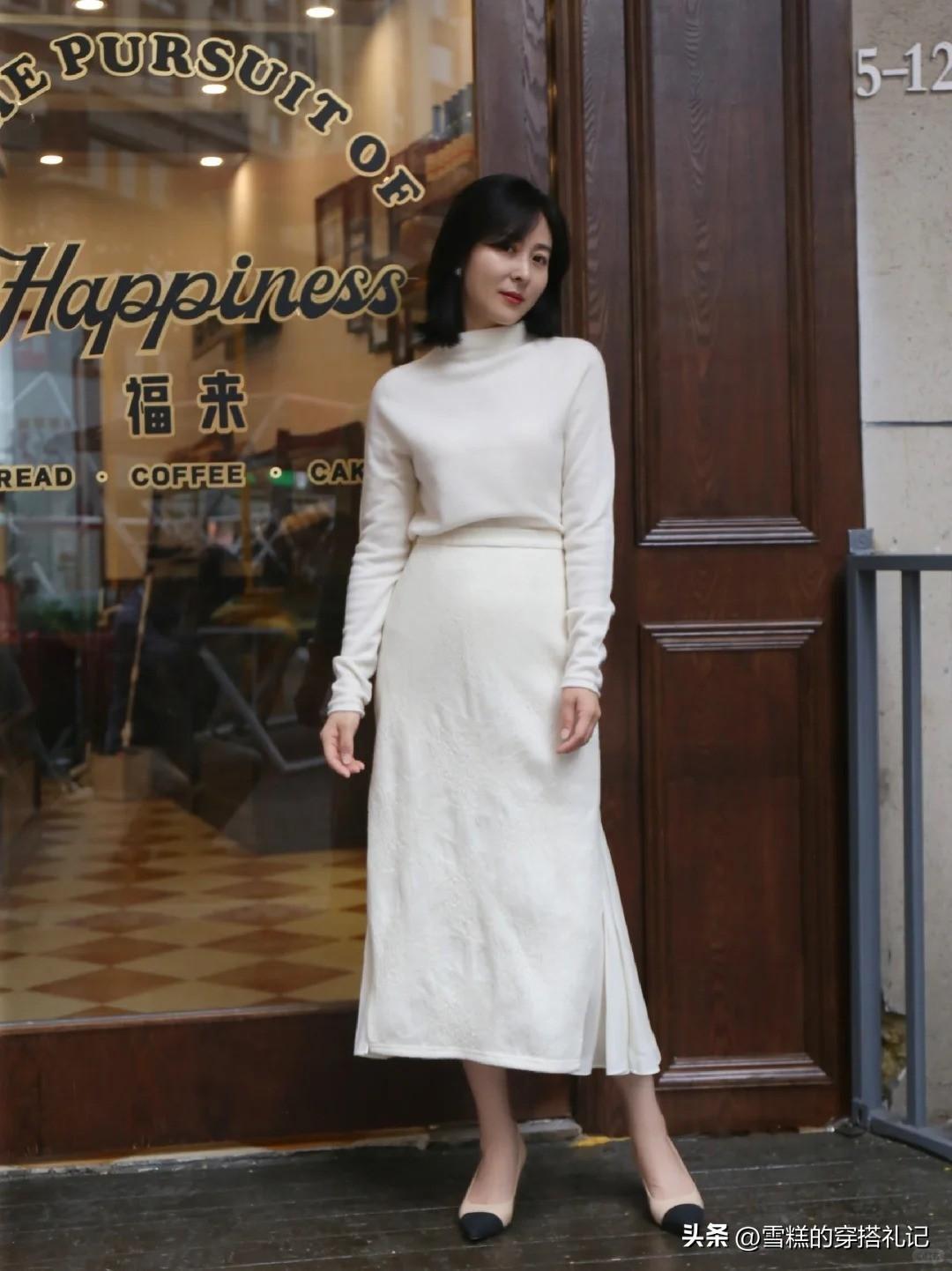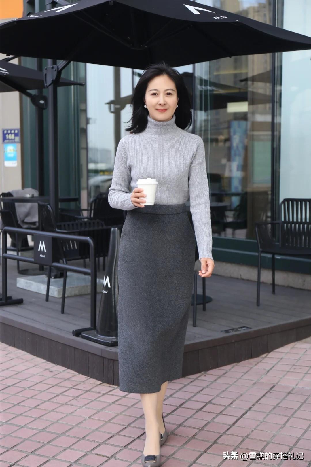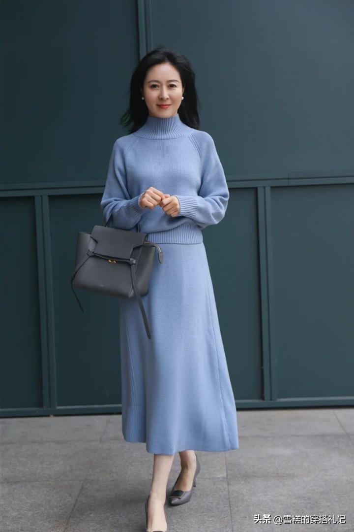下半部分則配合帶着高腰的同色系針織半身裙,裙長位置在小腿肚,整個的遮肉實力瞬間加倍,腳上隨便配一雙帶點跟的皮鞋,整個就會是氣質型淑女一枚。