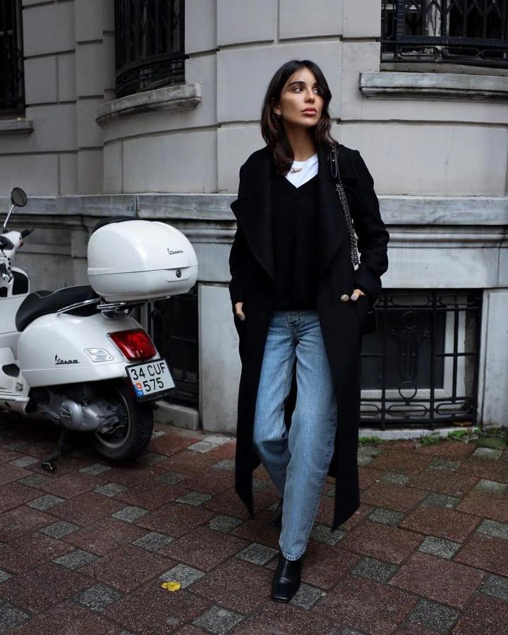 黑色大衣配牛仔褲,可以說是非常經典百搭和耐看的了,再加上一雙短靴,瞬間就提升整個穿搭氣場。