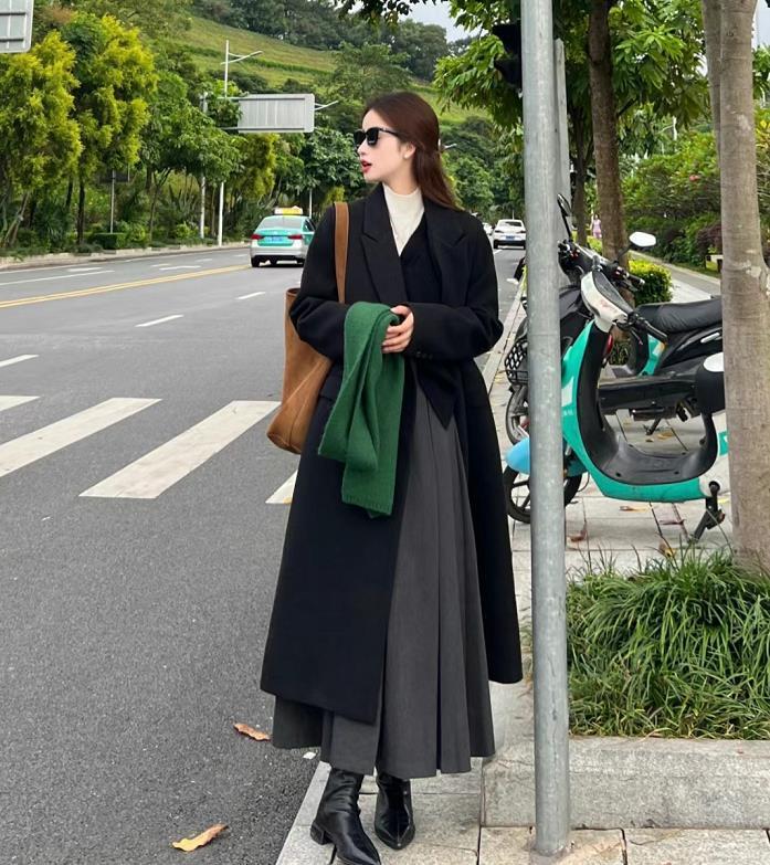 秋冬最百搭的大衣了,黑色大衣當之無愧啊,內搭淺色長裙超溫柔氣質的,想要提亮整個造型的話,只需混搭小面積的彩色配飾即可。