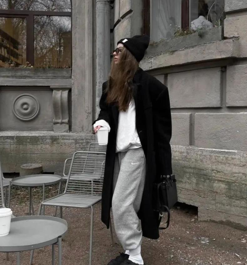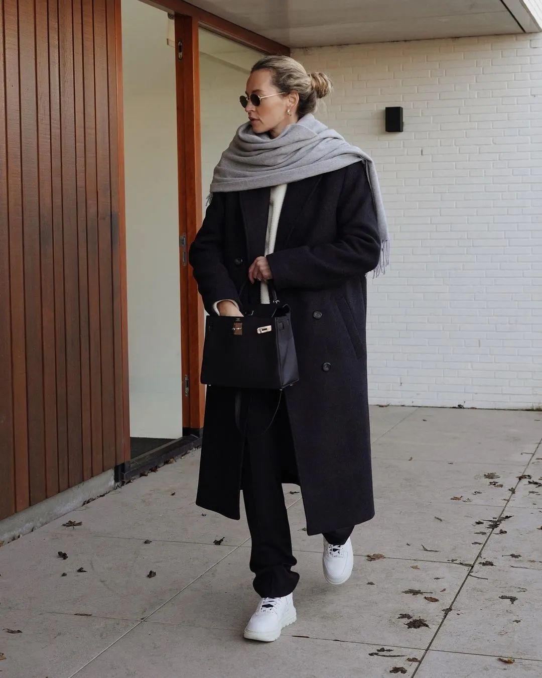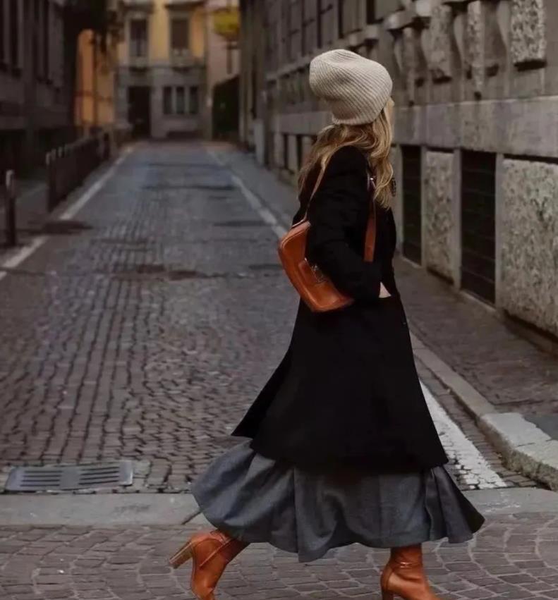 不管在什麼時候,灰色+黑色+白色這幾種配色都是不過時的,超級經典百搭,沉悶的黑色大衣,內搭就要用白色來平衡。灰色的百褶裙,讓穿搭看起來更高級了。