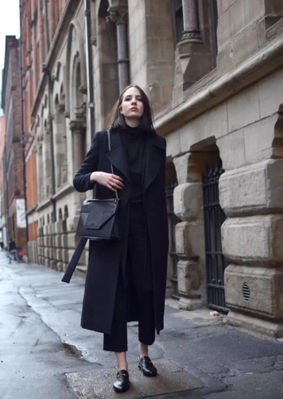 黑色大衣+黑色褲子,同色系的穿搭就是很顯瘦高級啊,如果鞋子也是選擇同樣的顏色,就可以將腿部線條延長了。