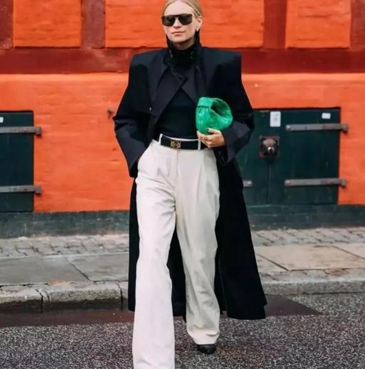 冬天穿黑色大衣,該怎樣在人羣中脫穎而出呢?選擇白色闊腿褲來配,休閒日常,簡約又大方。要注意的是,懂得利用小面積亮色點綴,這樣整體的穿搭就更加時髦吸睛了。