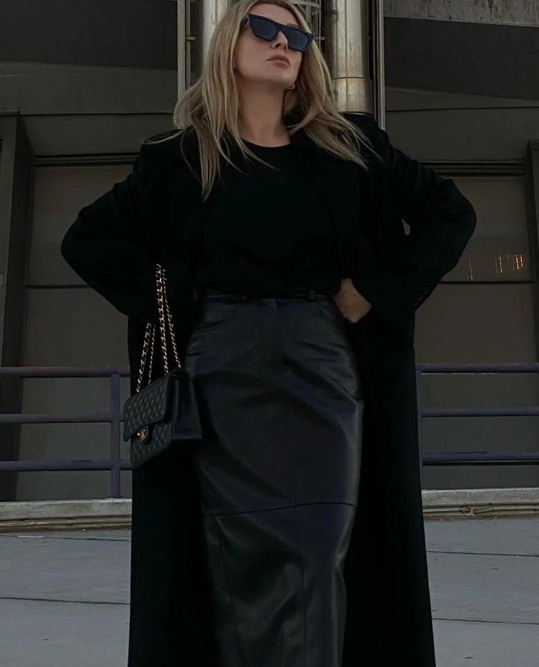 一身黑色系的穿搭,方便舒適又顯氣場,高級感滿滿,擔心會穿出沉悶,可以利用材質差異來打造層次。