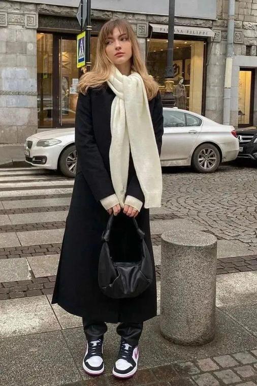 黑白配可是最經典的穿搭,簡約又時髦,黑色大衣+白色內搭,膚色暗沉的姐妹就可以起到提亮的效果。