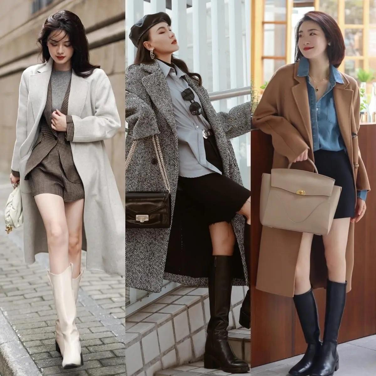 如果是比較年輕的姑娘,或者喜歡比較時髦熱辣的風格,我們可以嘗試大衣+長靴的組合,露出雙腿線條、時髦又摩登。