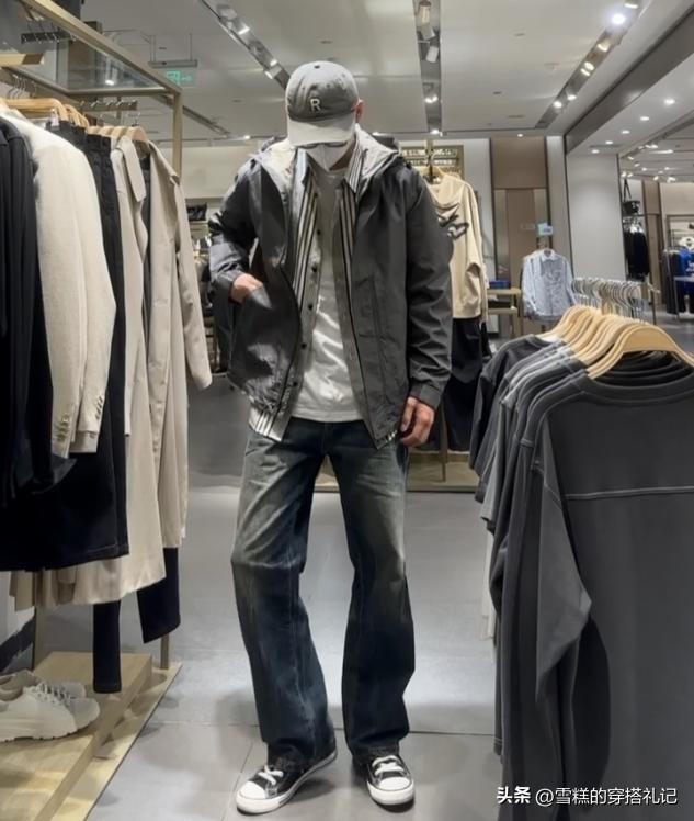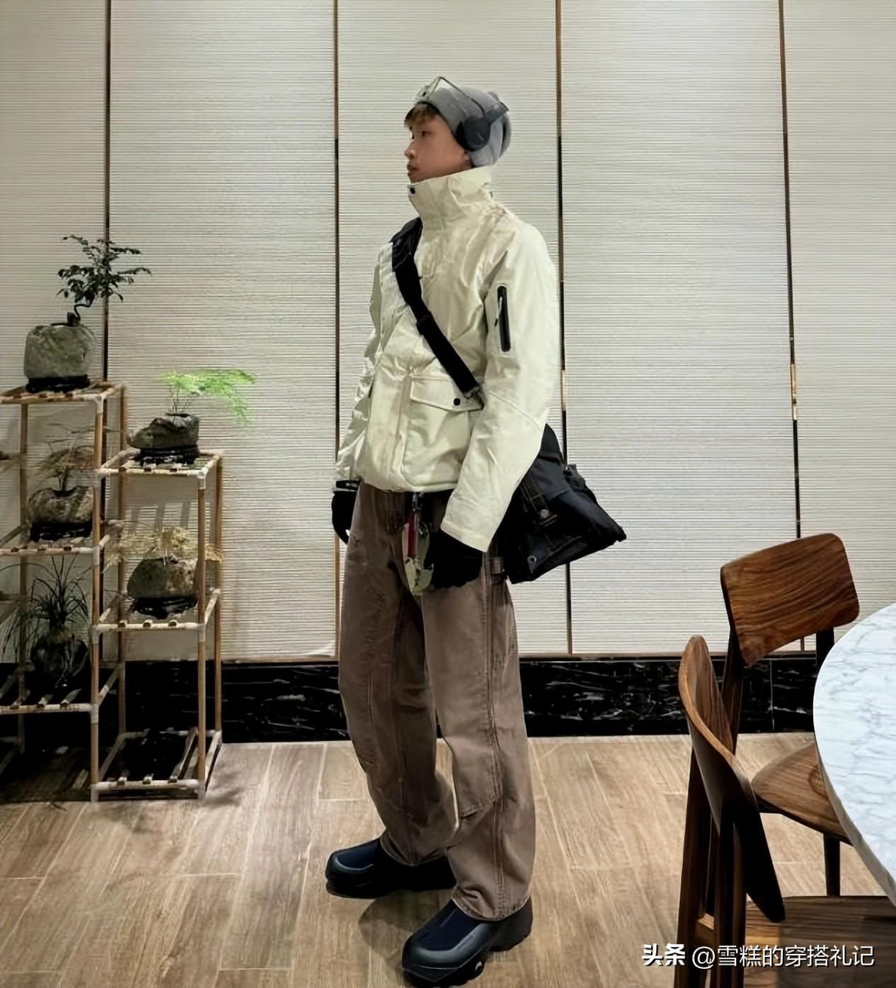 ※衝鋒衣敞開穿,工裝褲適合展示高腰線