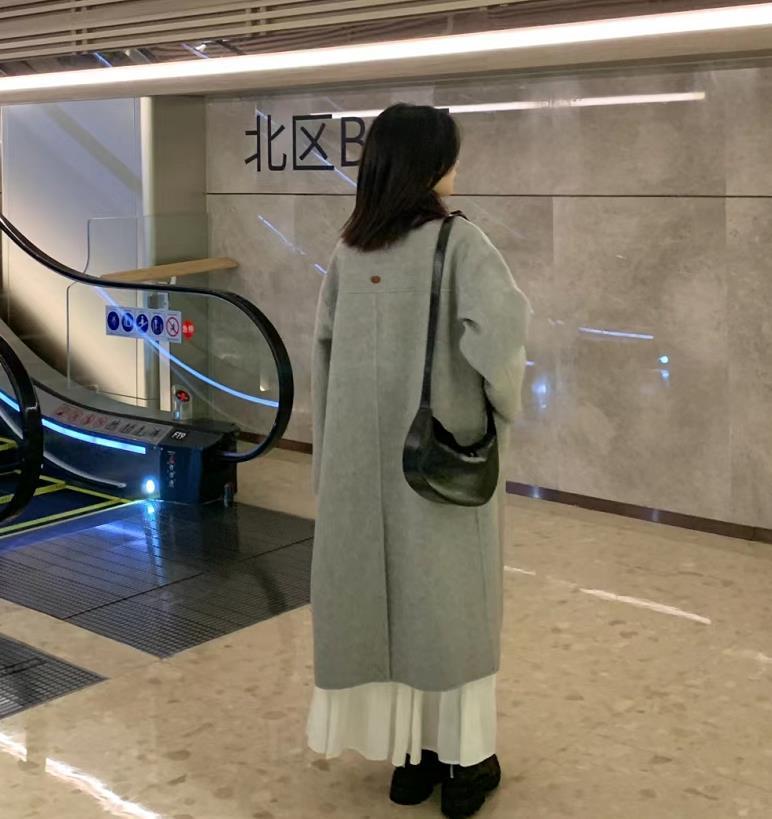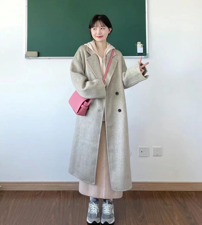 灰灰的,看起來好溫柔高級啊,這一件淺灰色羊絨大衣,無論是質感,還是版型都極好的。大衣的垂墜感超讚,上身就是那種很有品質的效果。