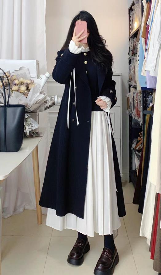 秋冬的穿搭就是要氣質優雅,更要保暖好看,黑白配色的組合,最是耐看和時髦了。黑色長款大衣+白色百褶半身裙,也太美了。