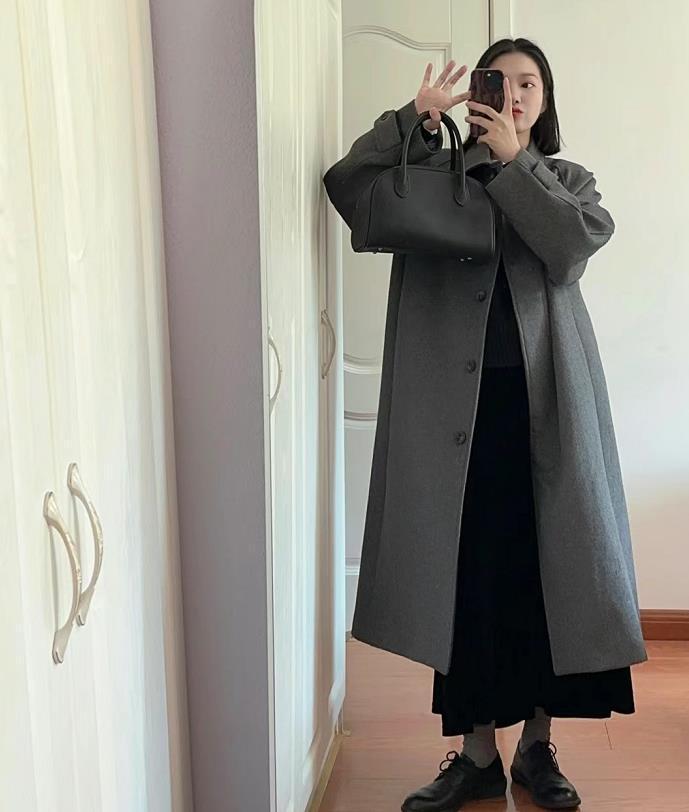 款式比較簡約大方的灰色大衣,版型很正,結合黑色百褶半身裙,灰+黑的配色絕了。