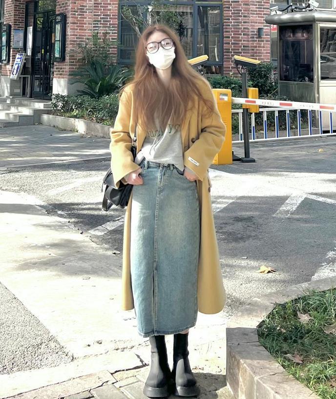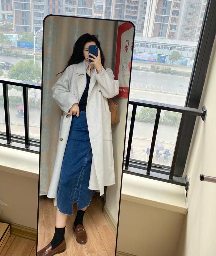 白色的大衣真的很百搭,而且穿起來也很顯氣色,我在裏面搭配的是黑色打底衫和牛仔半裙,這麼穿頗有幾分韓劇女主角的範。
