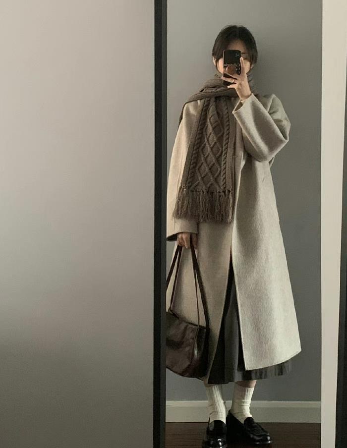 這套是真的好好看啊,大衣與裙子的組合,就是最完美的一對cp了,灰色百褶半身長裙,自帶高級優雅和氣質。利用圍巾進行點綴,增加時髦度的同時又保暖。