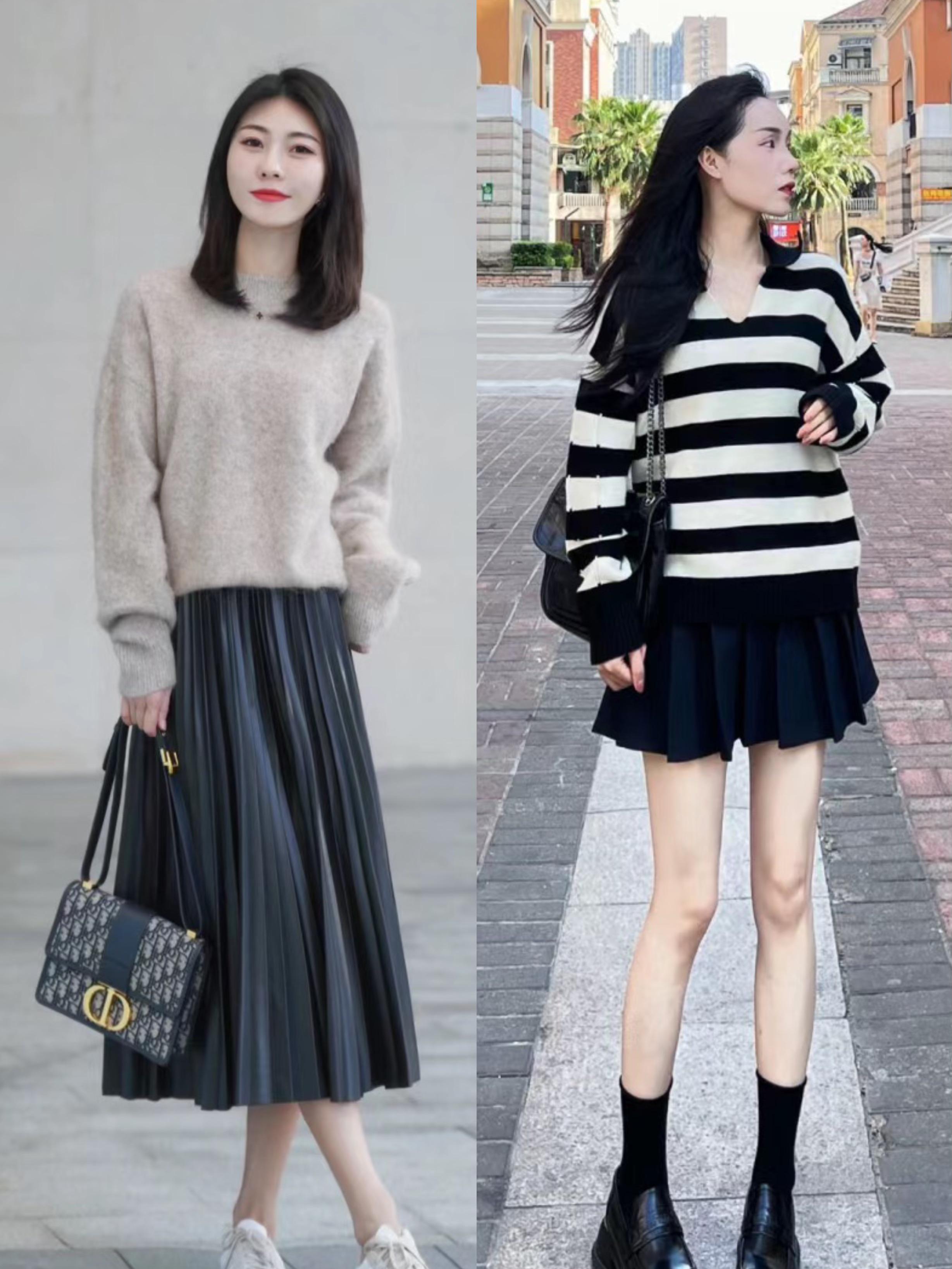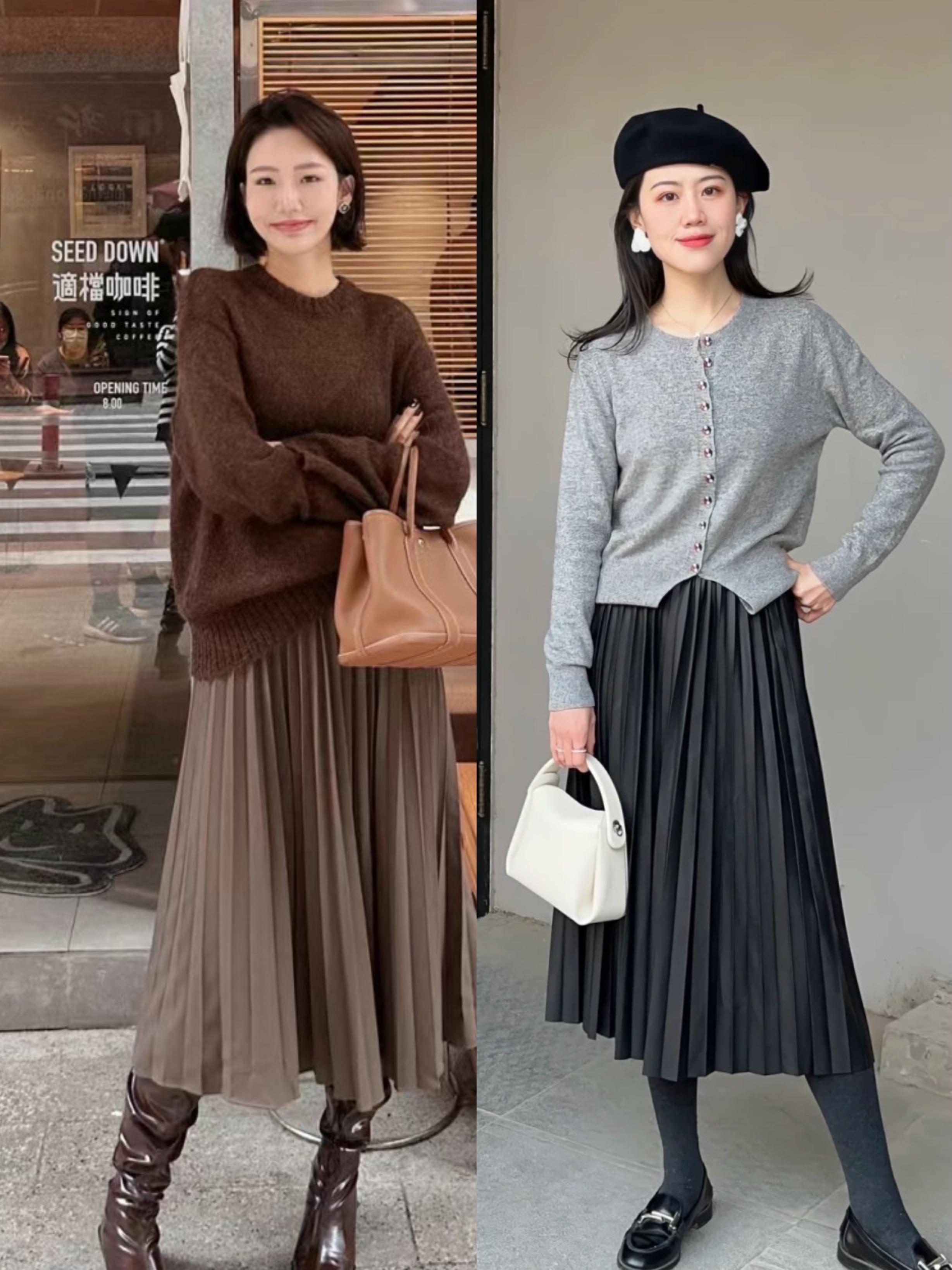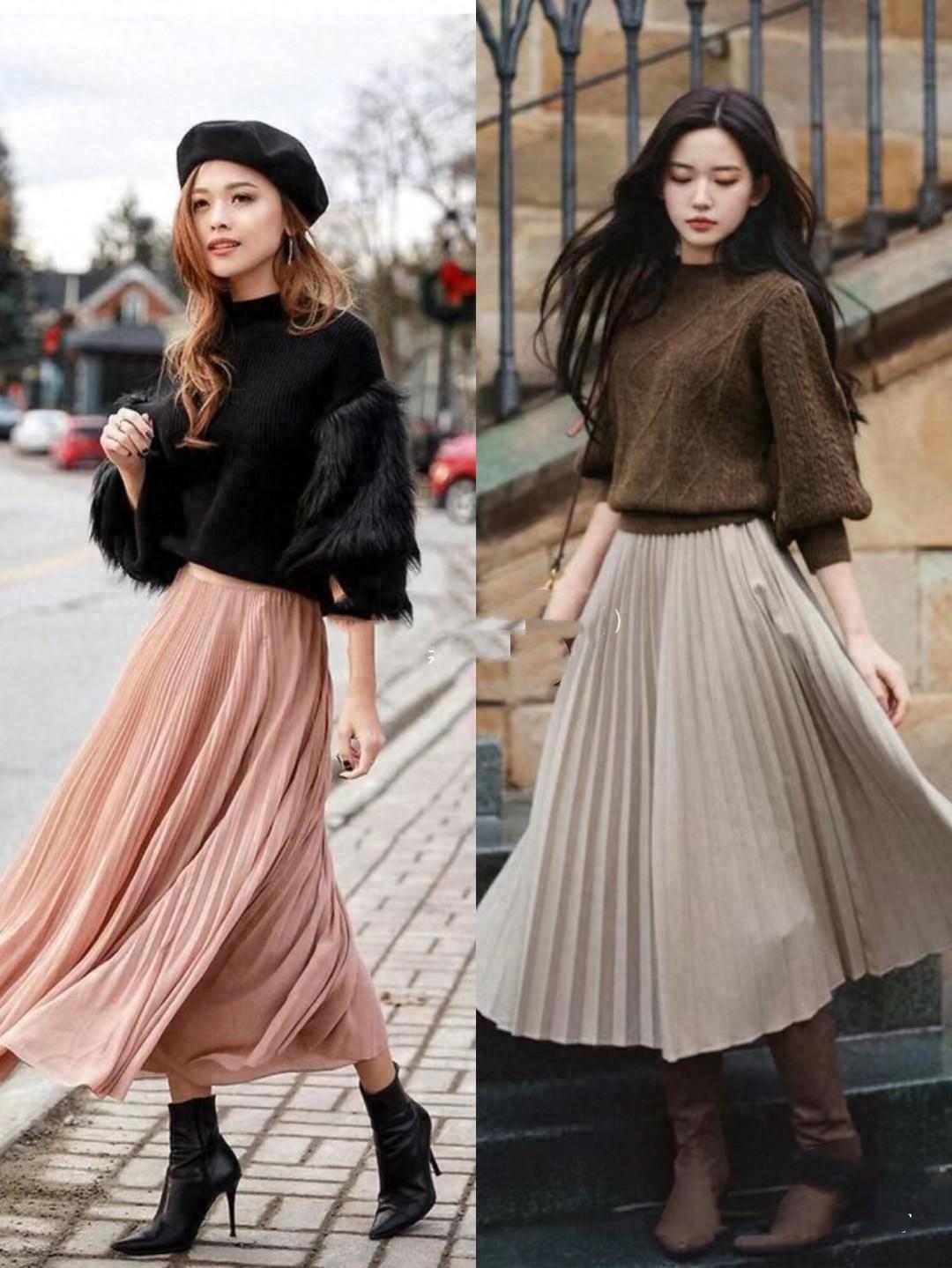 不管是修身的毛衣,還是寬鬆一點的毛衣,都可以搭配細膩的百褶半身裙。隨着裙襬的搖曳,有一種更加浪漫的風情,搭配樂福鞋或者長筒靴都很耐看。