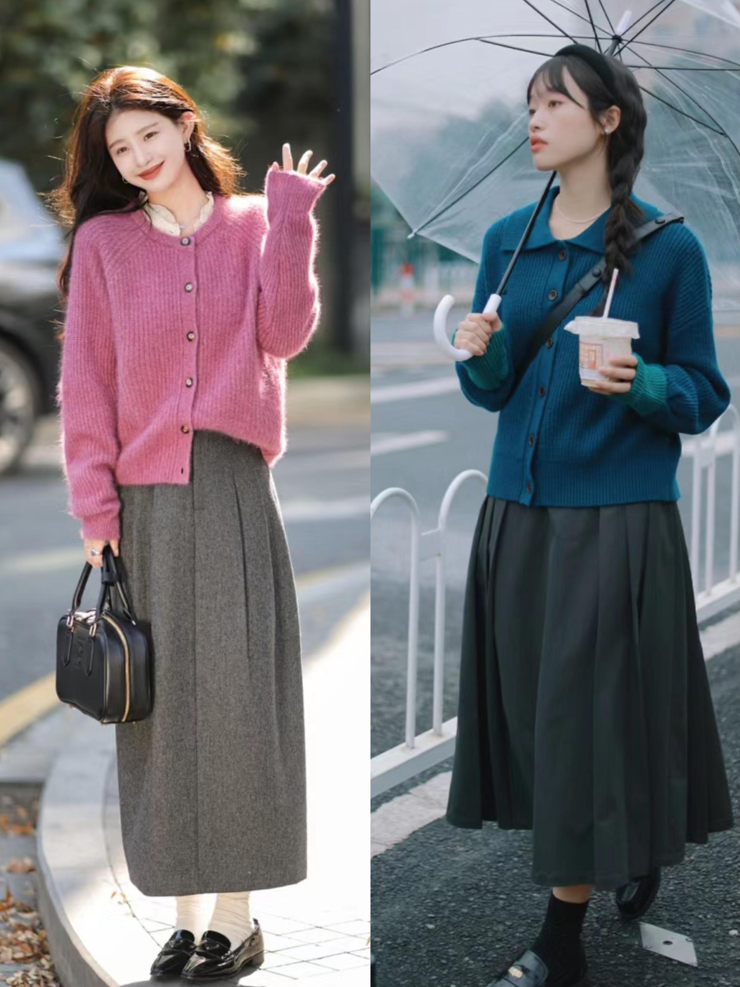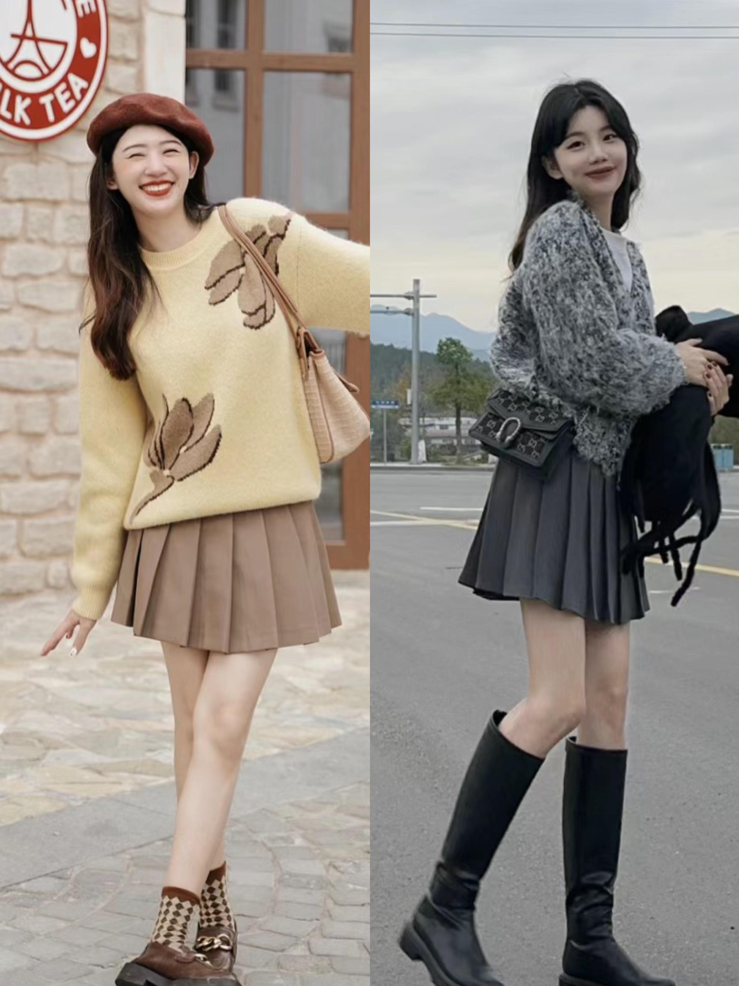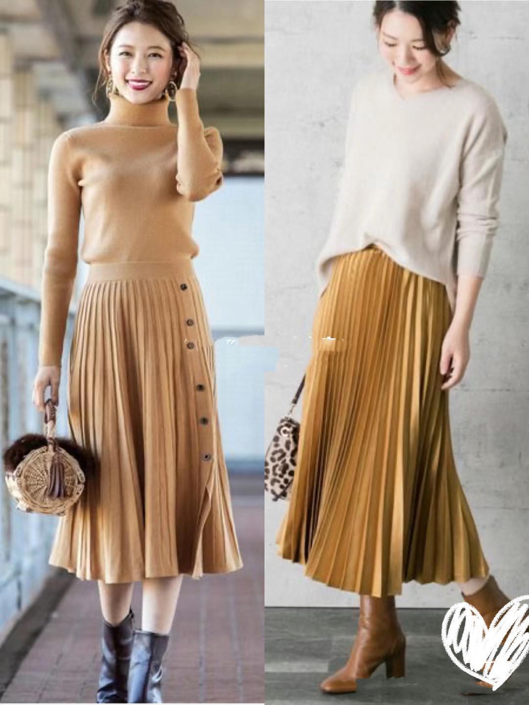 不管是修身的毛衣,還是寬鬆一點的毛衣,都可以搭配細膩的百褶半身裙。隨着裙襬的搖曳,有一種更加浪漫的風情,搭配樂福鞋或者長筒靴都很耐看。
