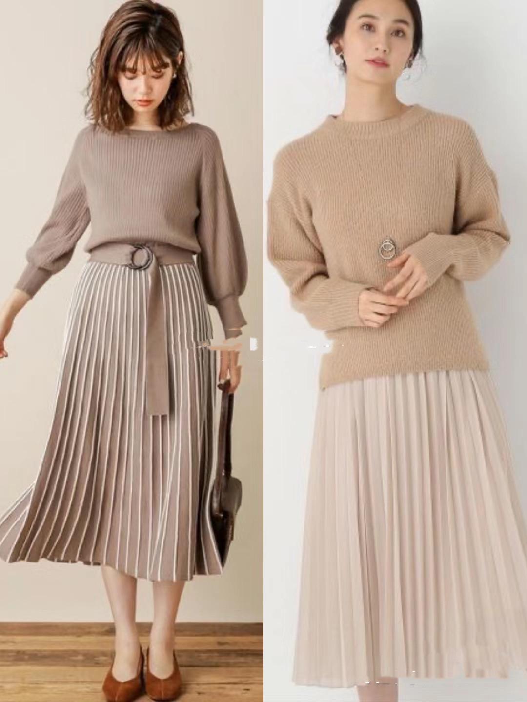當我們選擇細膩的毛衣+精緻的百褶裙時,可以嘗試運用同色系的搭配,來表現出更加大方高級的美。燕麥色的毛衣、配燕麥色的百褶半身裙,溫柔又浪漫。