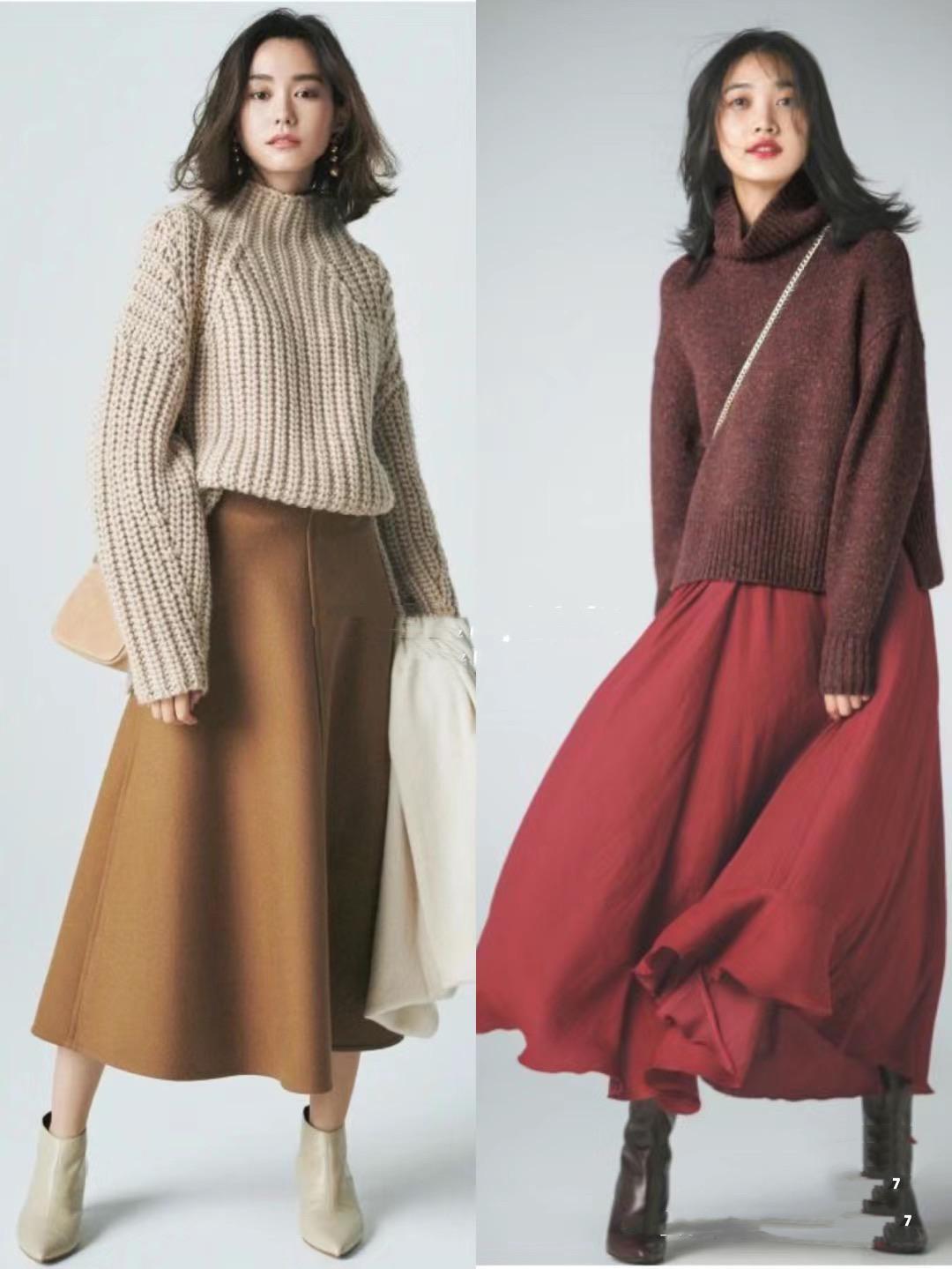 寬鬆且厚重的毛衣,與毛呢質感的半身裙,也是一組特別合拍的搭檔,高腰的毛呢半身裙、流暢的A字形剪裁、配合傘裙的款式,包容性更強、體面又大方。