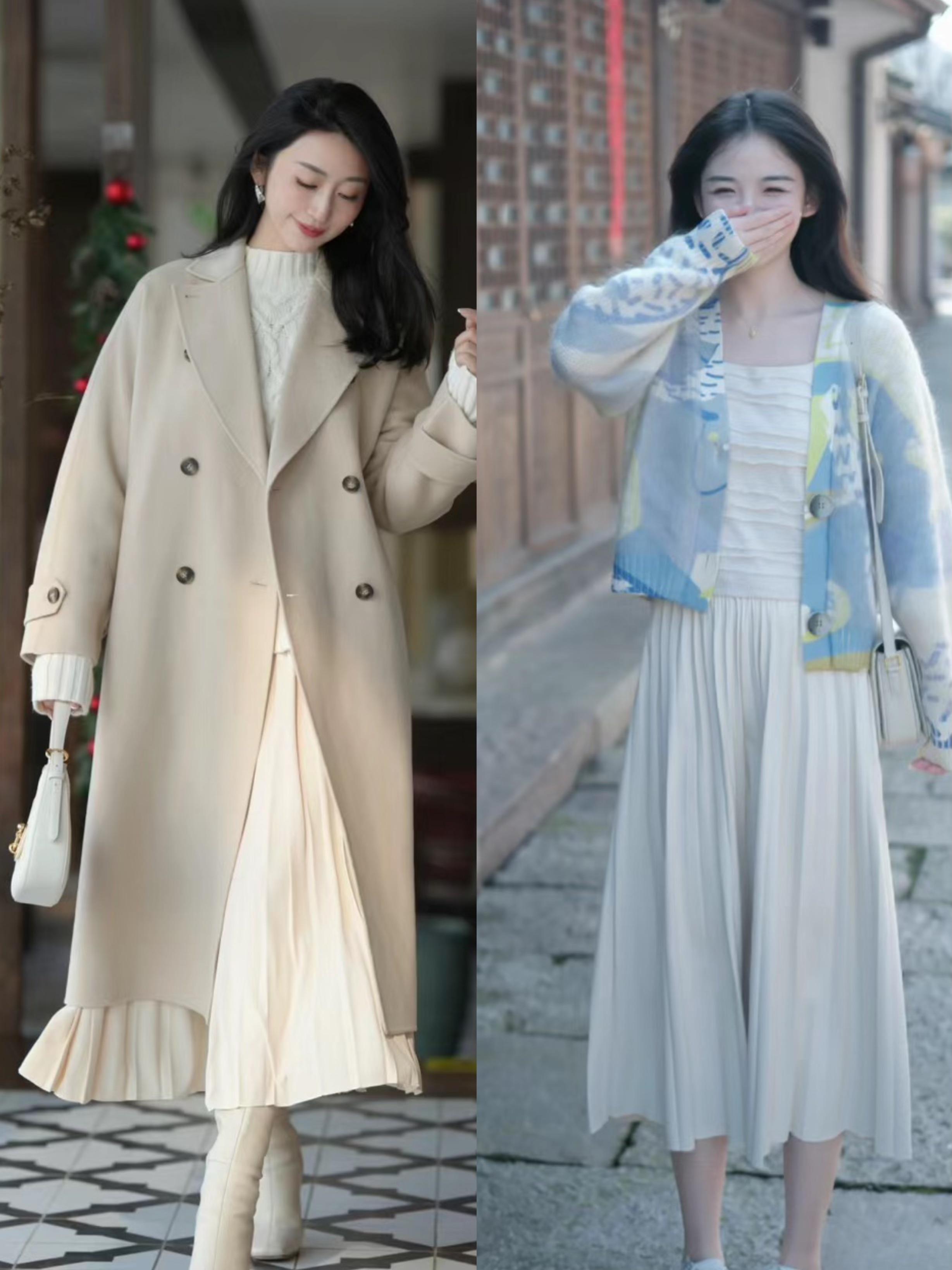 粉色系或者米白色的百褶裙,棕色系或者黑色系的慵懶風毛衣,隨意的搭配就可以生出萬種風情。素雅、大方,溫柔、減齡,表現着不動聲色的美好。