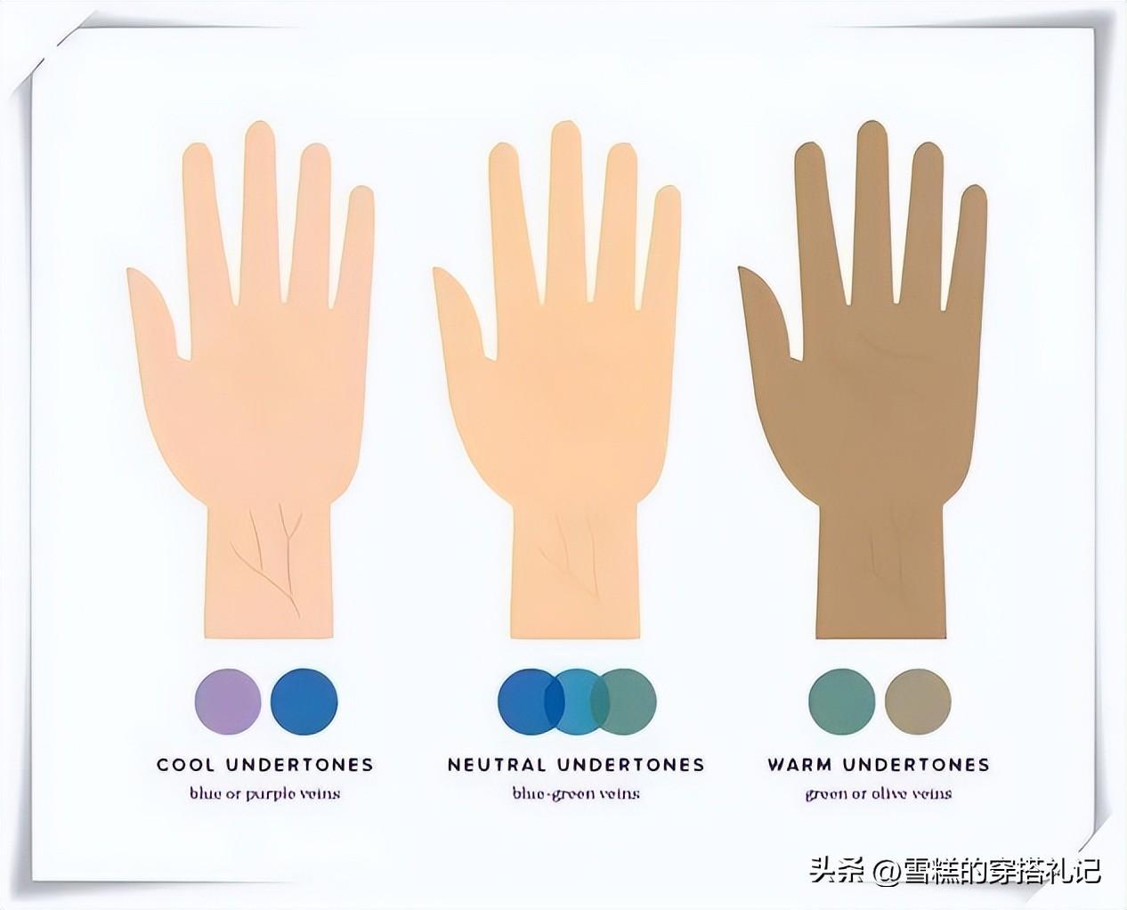 大家可以根據手腕血管的顏色來分辨暖皮還是冷皮,如果血管中青色居多,那麼你就是冷白皮,如果紫調偏多,那麼你就是暖黃皮。而在色彩選擇上冷白皮多選紅色藍色這些富有冷色調的顏色,上身更加的顯白洋氣,還能夠襯托出清冷感,而暖黃皮多以溫柔的暖色調爲主,可以襯托的整個人更加淡雅一些。