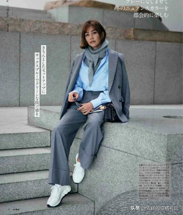 在黑白灰當中,如果要論氣質色,當屬灰色,它能夠更好地襯托出質感,建議大家可以嘗試與藍色系單品進行協調有明有暗的點綴下,瞬間穿出了時尚與氣質,但建議選擇同種面料搭配會更加自然一些。