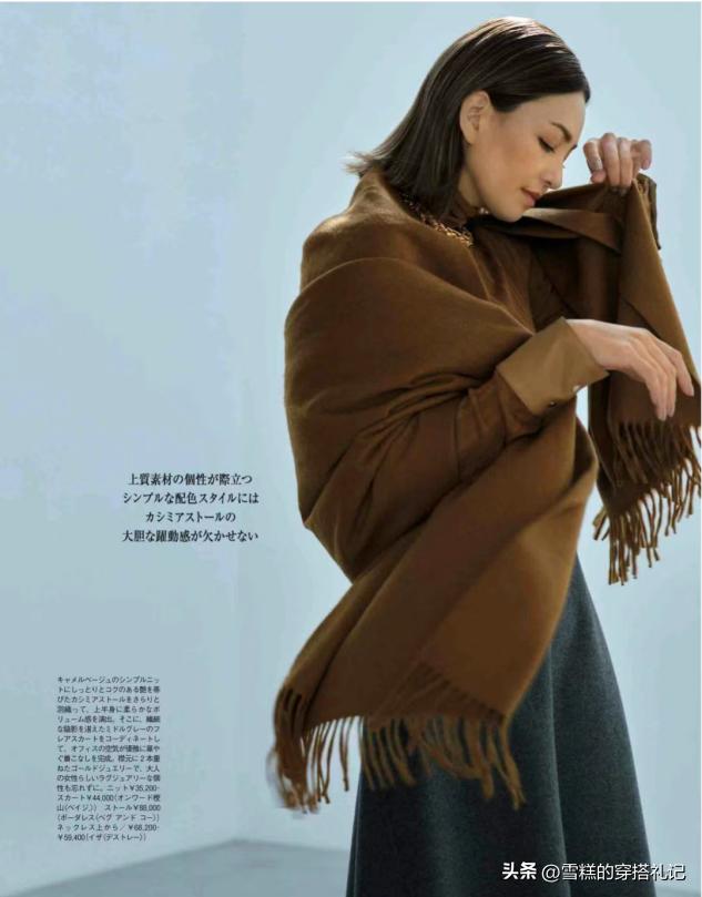 如果是色調飽和度較高的焦糖色深棕色的單品,大家一定要善於用白色進行過渡和點綴,比如焦糖色的大衣,配上同色系的長裙整體組合下來更加的有氣質,在頸間加一條白色的圍巾進行搭配,瞬間就打破了沉悶還隔離了面部更加顯白一些。