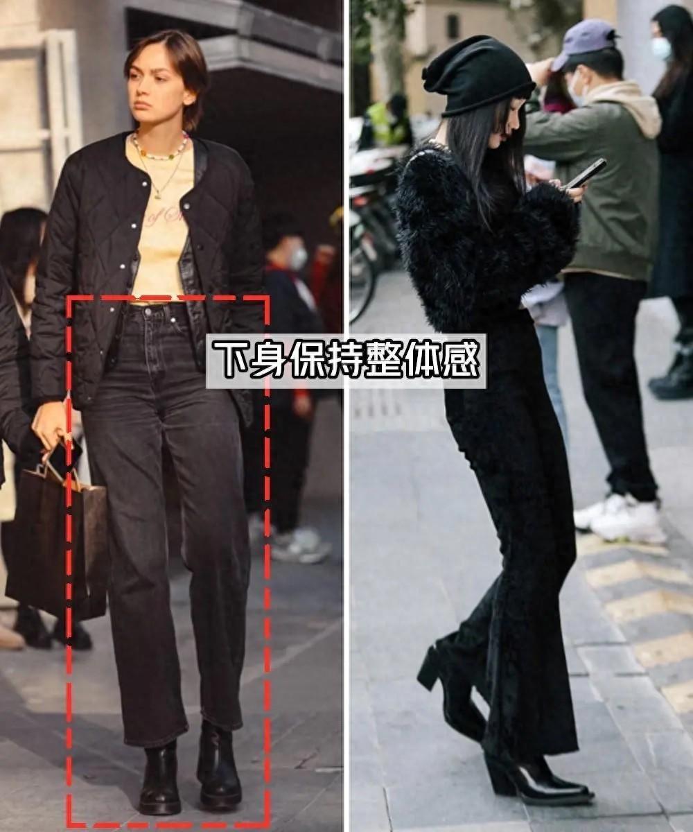 小黑褲與闊腿褲,其實在視覺上是可以形成鮮明對比的。闊腿褲是寬鬆舒適的,小黑褲則是緊緻修身的。