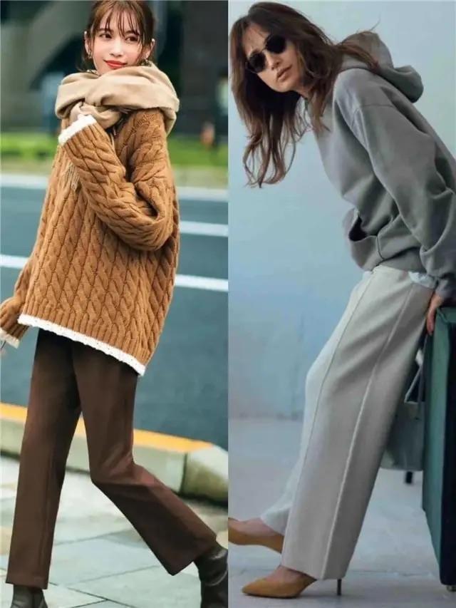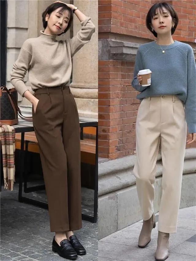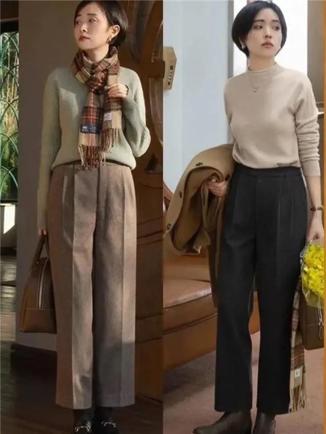 米白色的煙管褲,有一種溫柔又有力量的美。毛呢面料的煙管褲,軟糯厚實且比較保暖。我們可以搭配寬鬆的棕色毛衣,舒適大方還可以弱化年齡感。