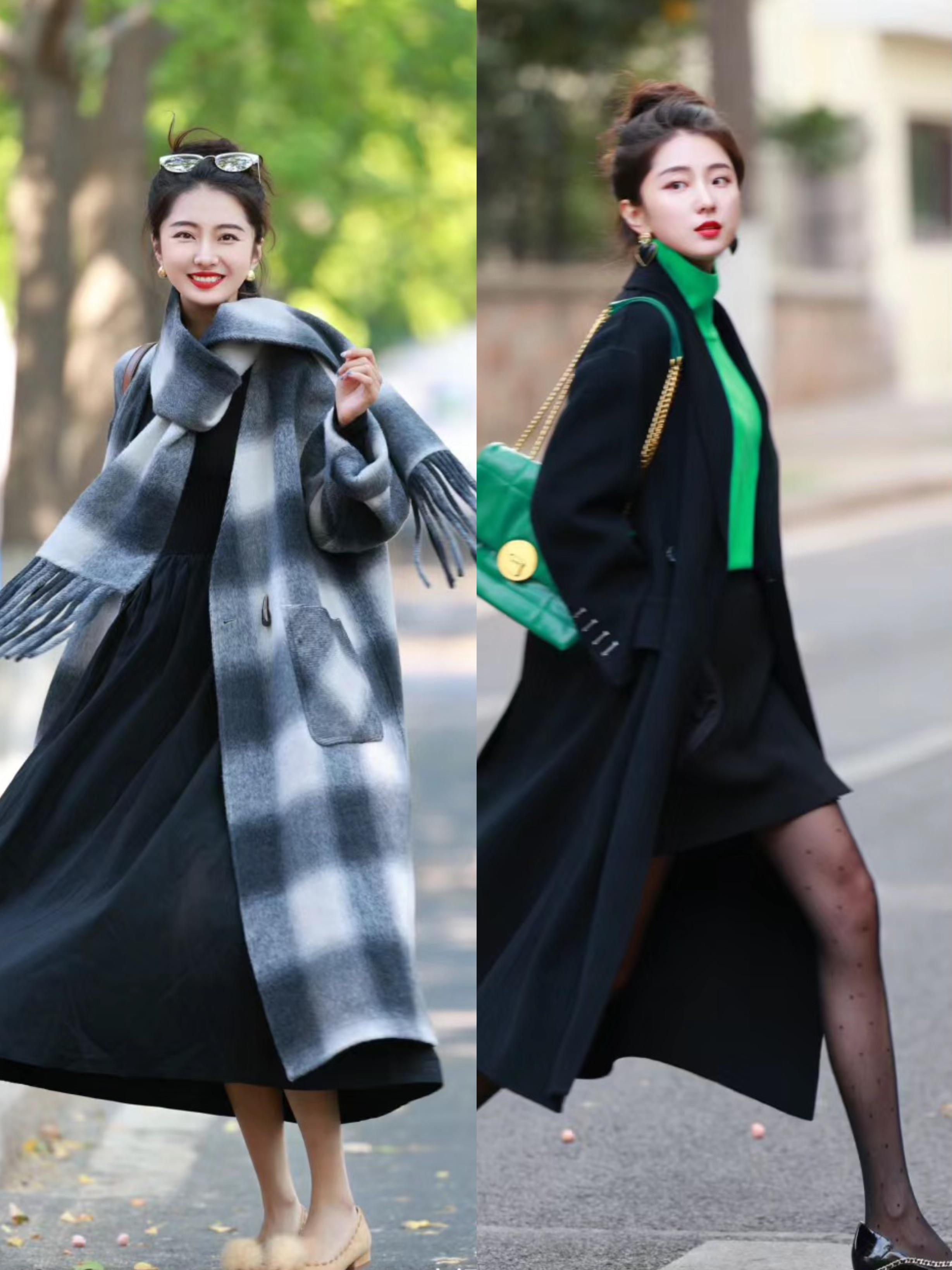 黑色大衣,可以配亮色系的半身裙,或者格子元素的圍巾。尤其是暖色系的格子圍巾,帶有一定的溫暖效果。長款的格子圍巾,作爲亮色修飾,提升層次感又更加保暖。