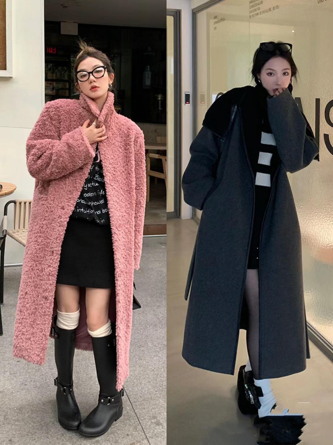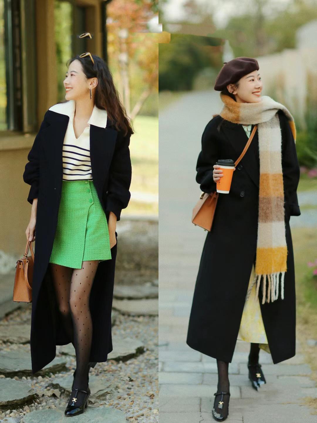 一件長款且厚重的大衣,可以搭配高腰的毛呢半身裙。短款的毛呢半身裙,剛好露出大腿的線條,有一種輕盈面料的美,把雙腿優越的比例呈現出來。