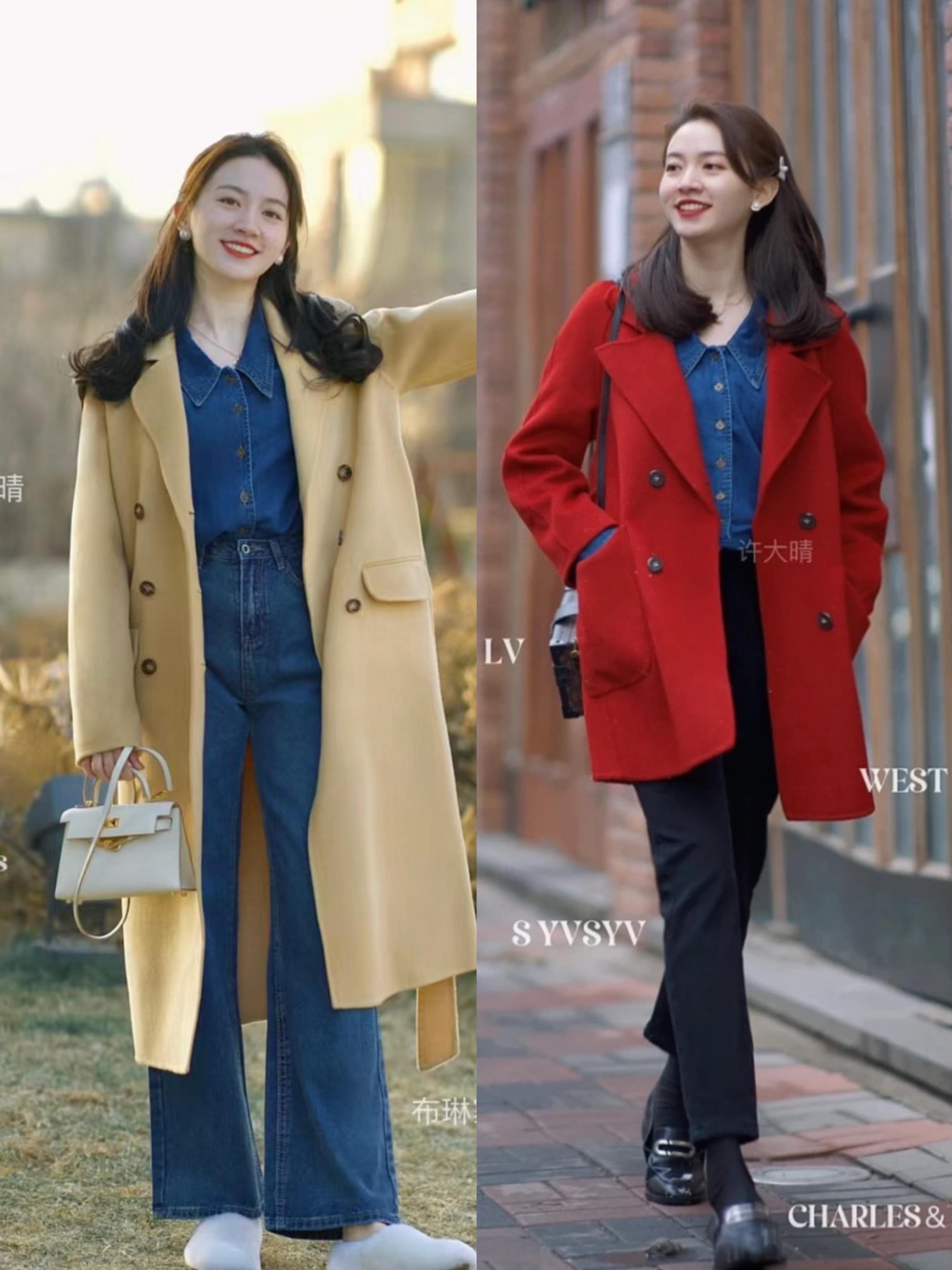 我們可以用經典的牛仔襯衫來搭配寬鬆一點的雙排扣大衣,雙排扣大衣基礎耐看、明亮的色彩充斥着年輕的魅力,搭配藍色牛仔襯衫,高級耐看、利落端莊。