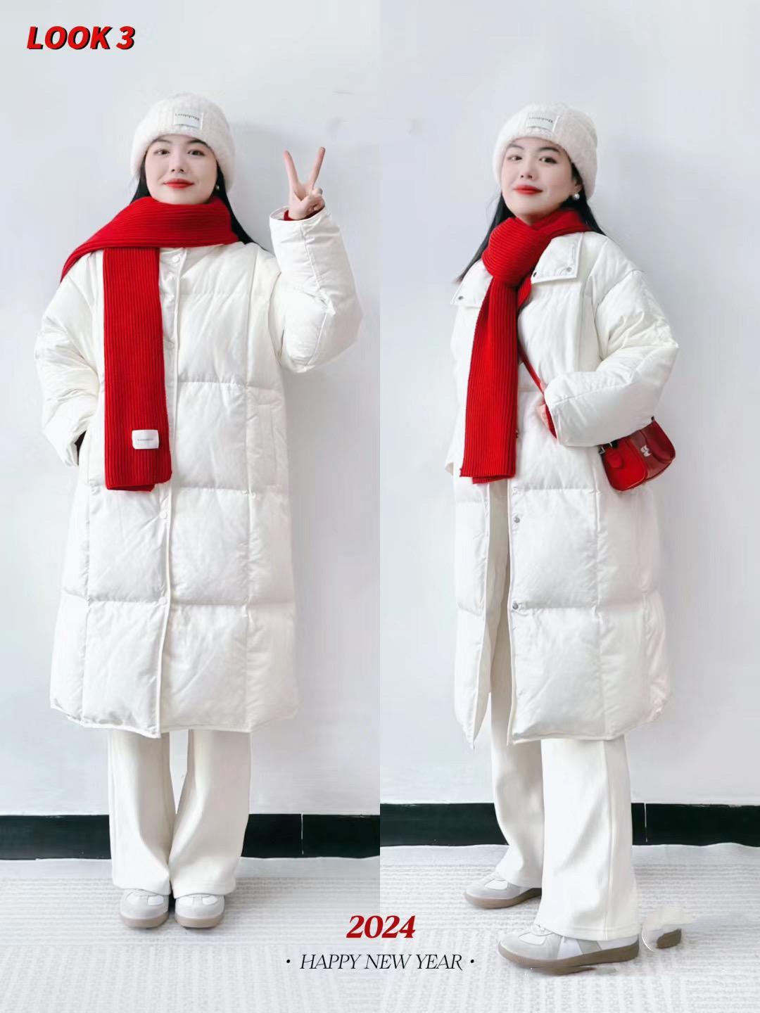 一件純白色的羽絨服,搭配同色系的闊腿褲,配德訓鞋透着青春的美感。而紅色的圍巾和帽子,成爲白色系中最醒目的點綴,很洋氣也很喜慶,還特別的好看。