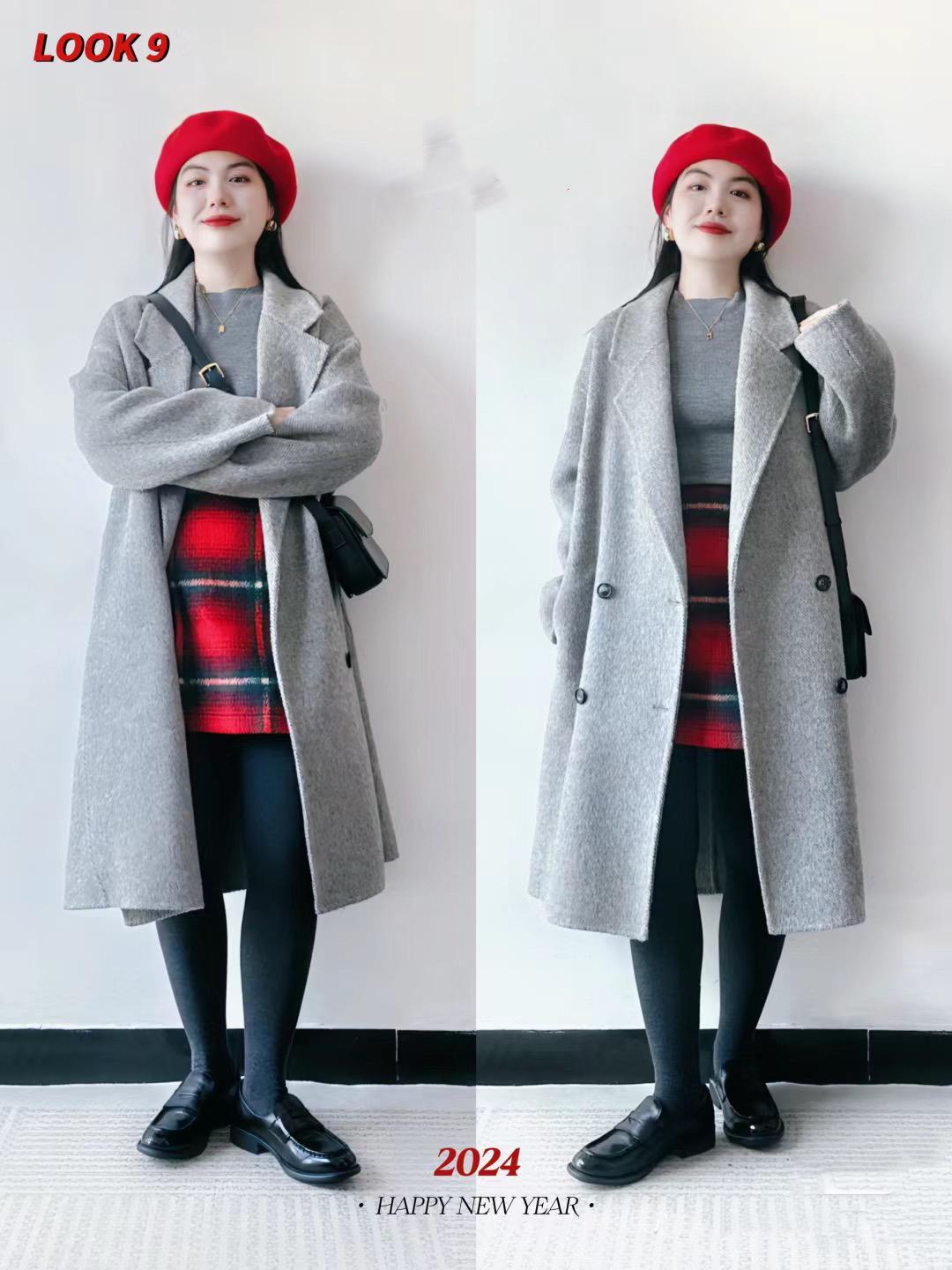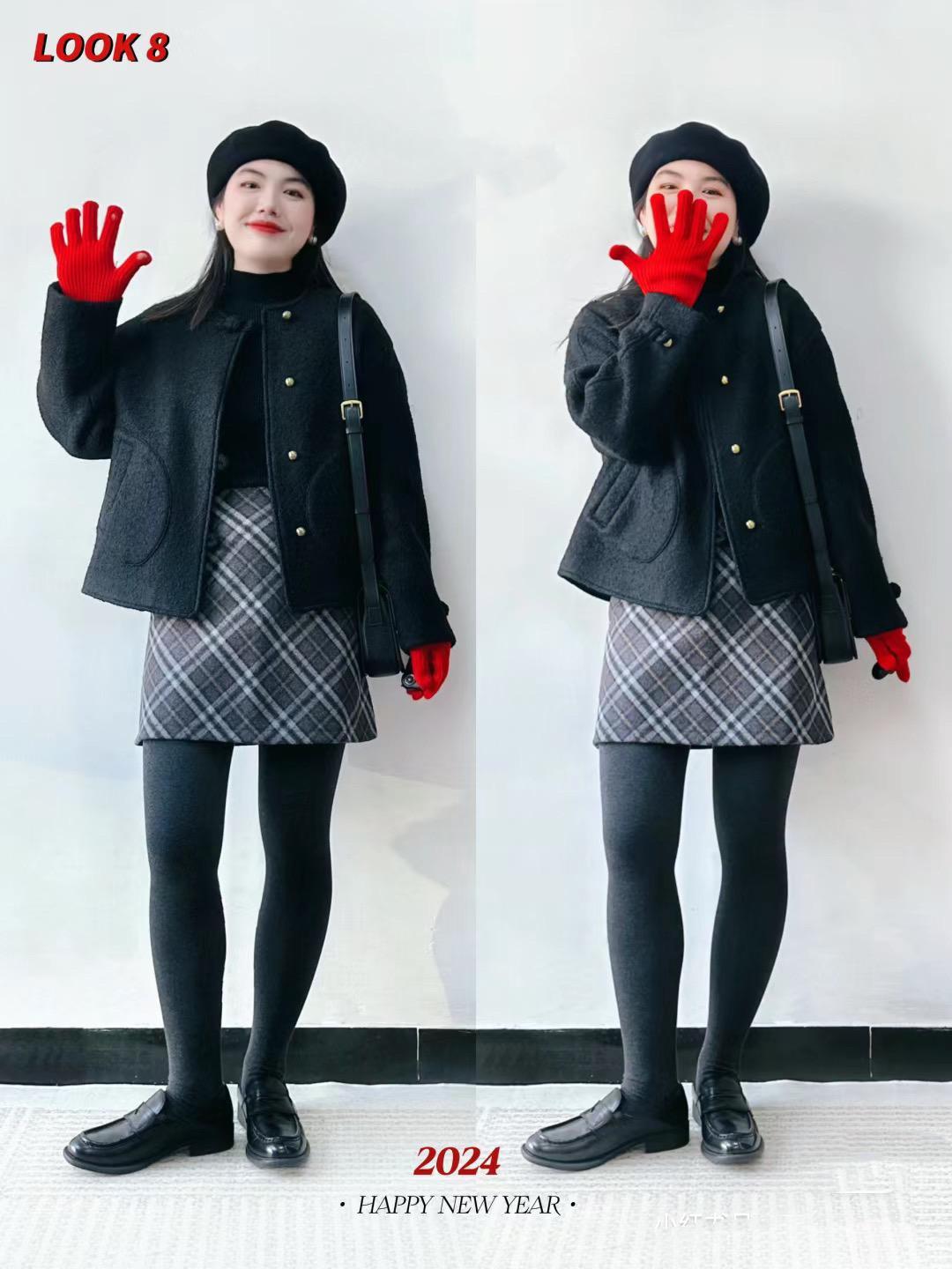 一件花灰色的毛呢大衣,搭配了紅色格子半身裙,帶着新年的喜慶又很高級。配一條灰色系的打底褲,可以顯得小腿纖細也更保暖。冬天穿裙子,可以配與外套同色的打底褲,高級又大氣。