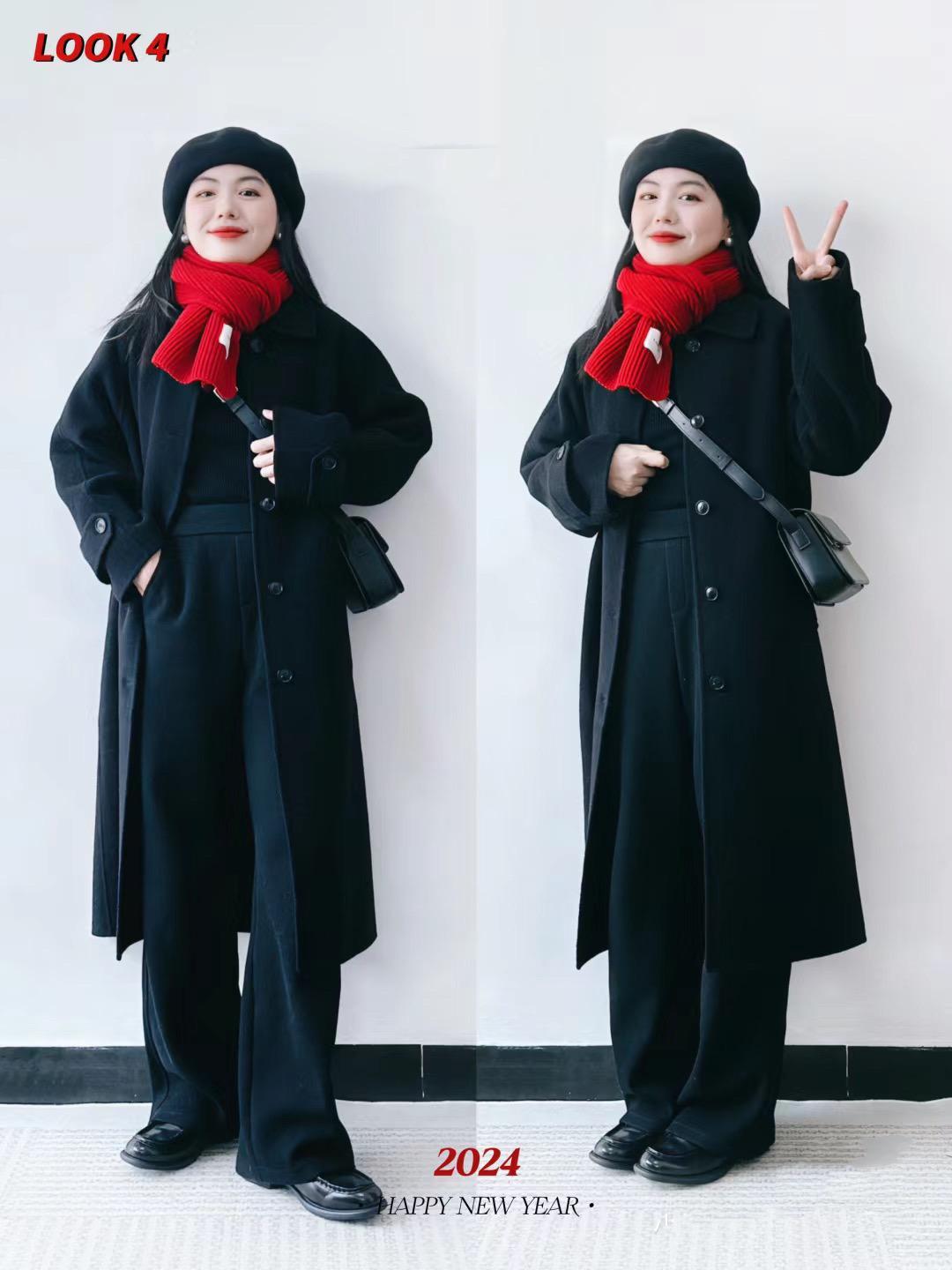 黑色系的大衣。可以配修身的黑色打底衫,條絨的闊腿褲,不同面料的對比層次清晰。搭配紅色圍巾,讓氣場十足的穿搭透着年味,真像是村裏的女王!