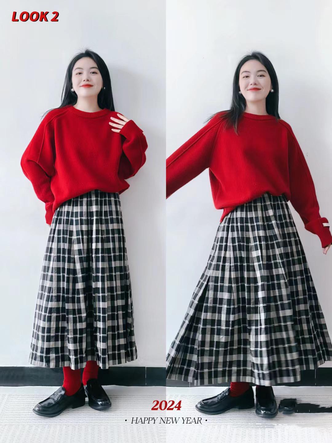 穿一件稍微寬鬆的紅色毛衣,配一條經典耐看的高腰的格子半身裙,簡簡單單的搭配不臃腫、不邋遢,利落又美好,配一雙厚底的小皮鞋,小個子也能輕鬆駕馭。