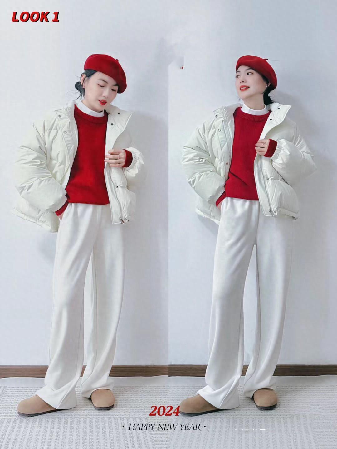我們穿小豎領的襯衫或者打底衫,來疊搭紅色毛衣或者針織衫,層次感清晰又更加保暖。配白色的闊腿褲、搭一件白色短款羽絨服,是很溫柔又浪漫的,也是大方嫺靜的。