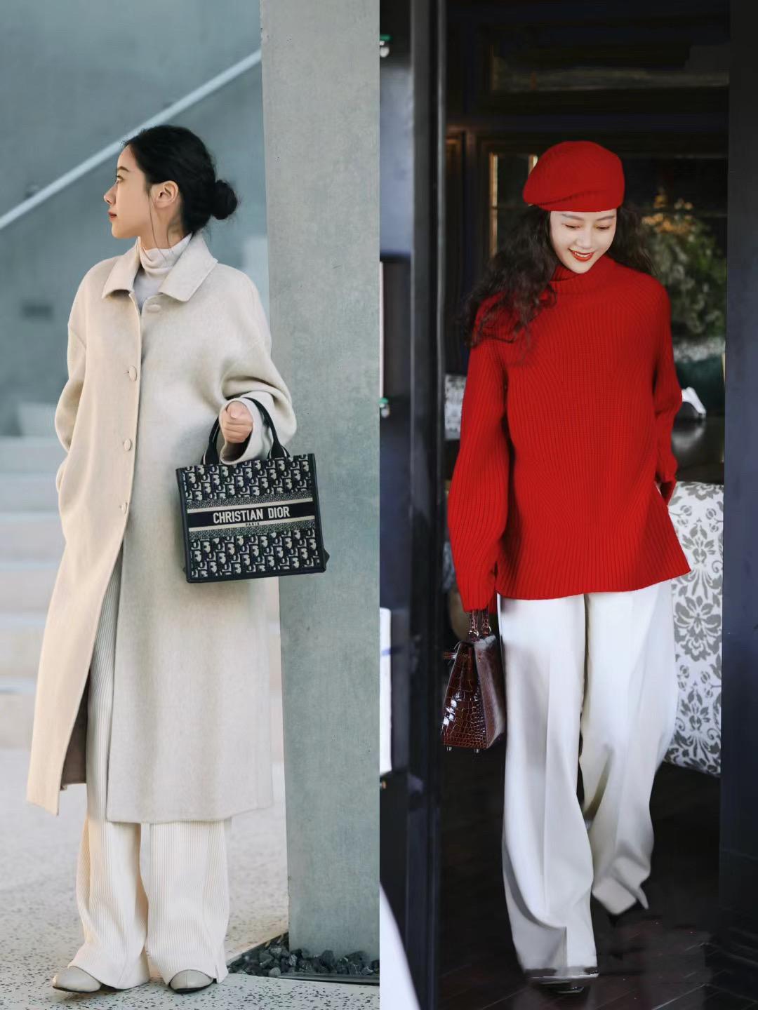 想要一種慵懶舒適的美,我們可以用白色闊腿褲搭配寬鬆的紅色毛衣,給人一種很貴氣很醒目的美。如果要溫柔雅緻的風格,選擇同色系的搭配也不錯,比如白色闊腿褲配燕麥色大衣,就很大氣。