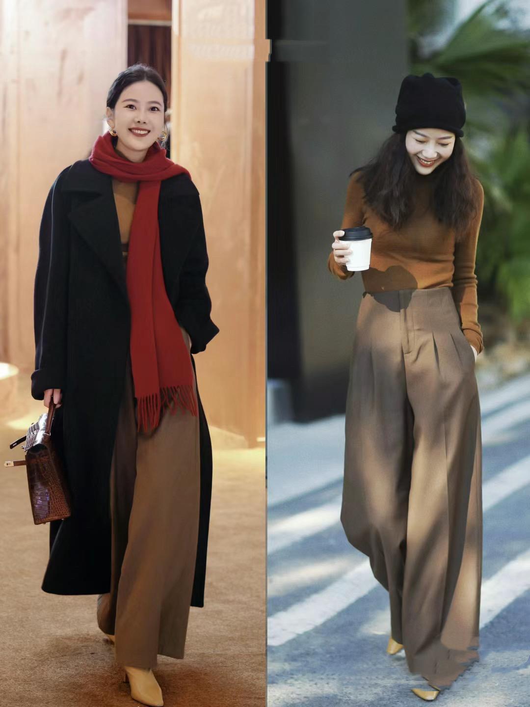 像這種棕色系的西裝褲,可以利用腰腹部收緊的設計,穿起來更加顯瘦。勾勒出腰部線條、更多了幾分溫婉美。外出的話,披一件黑色大衣,就更具氣場。棕色西裝褲的搭配,也更加溫柔有力。