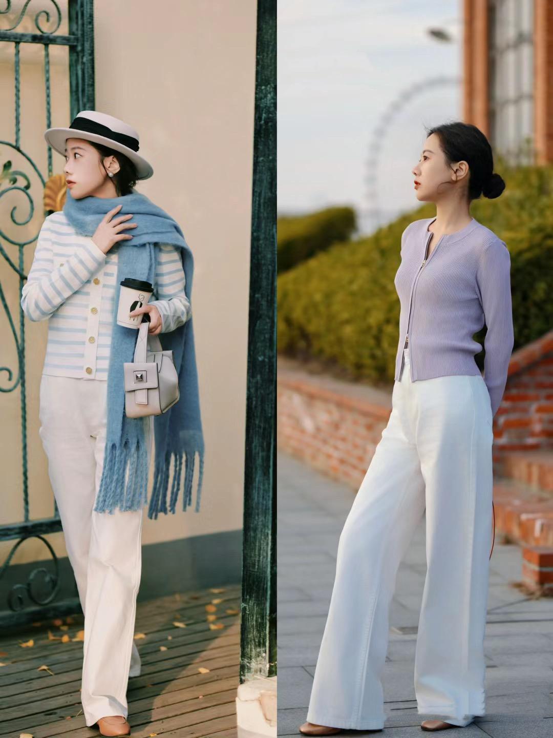 白色系的闊腿褲,可以讓我們的穿搭簡單更加清新溫柔。白色系具備了女性特有的時尚感,穿寬鬆的白色闊腿褲,配修身的針織衫,優雅又浪漫。