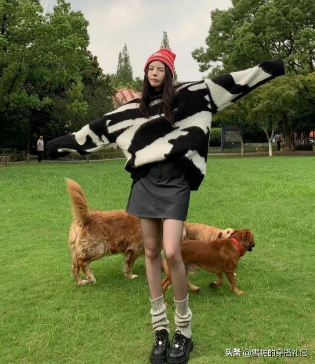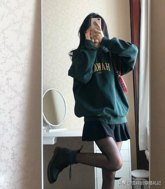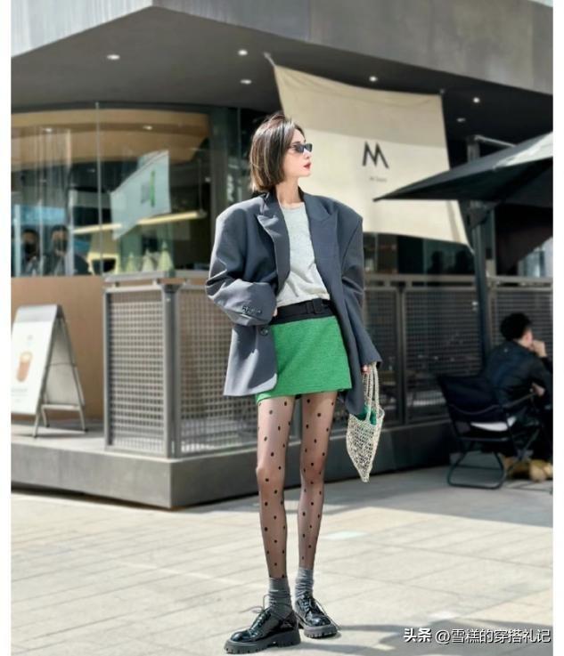 短裙和黑絲的組合,決定了我們的上衣款式也不會太長,這種帽子看起來衣物是上短下短的組合,其實最終把長線條的分量都分給了黑絲打造出來的腿長感,用來穿尖嘴鞋,小色塊的展示更呈現出了整體精緻度。