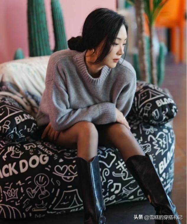 其次就是長筒靴的穿法,爲了更好的去延伸小腿曲線,靴子的長度無需過膝,預留出一些空間活躍的部位,穿搭的便捷性會很強。