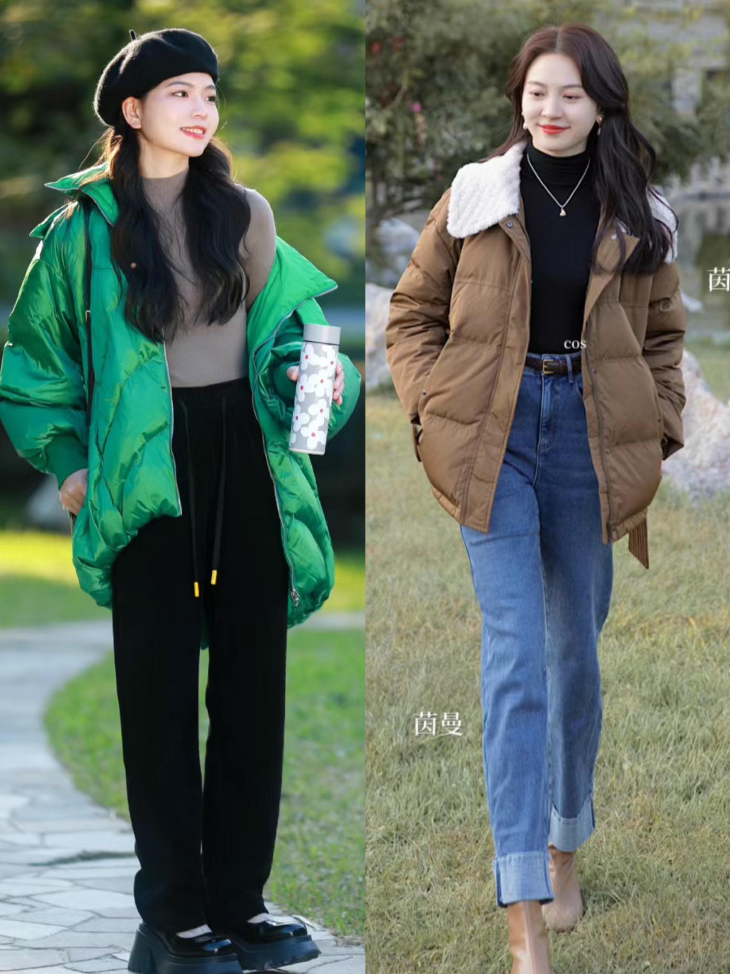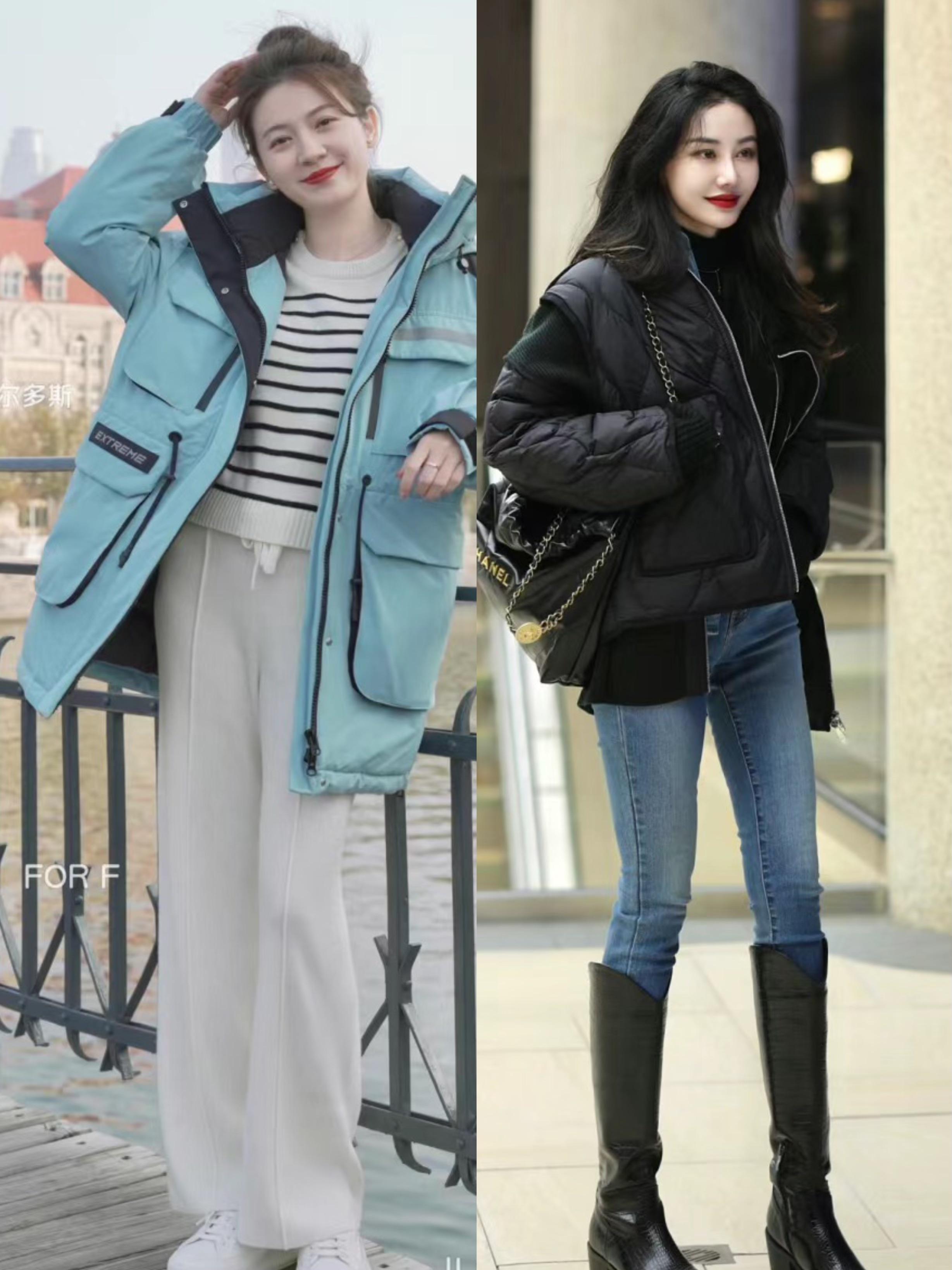 短款的羽絨服,可以搭配夾克款或者H型的設計,利落又洋氣。長款的羽絨服,更推薦大家選擇H型或者繭型的款式,穿起來利落大方又不會壓個子。