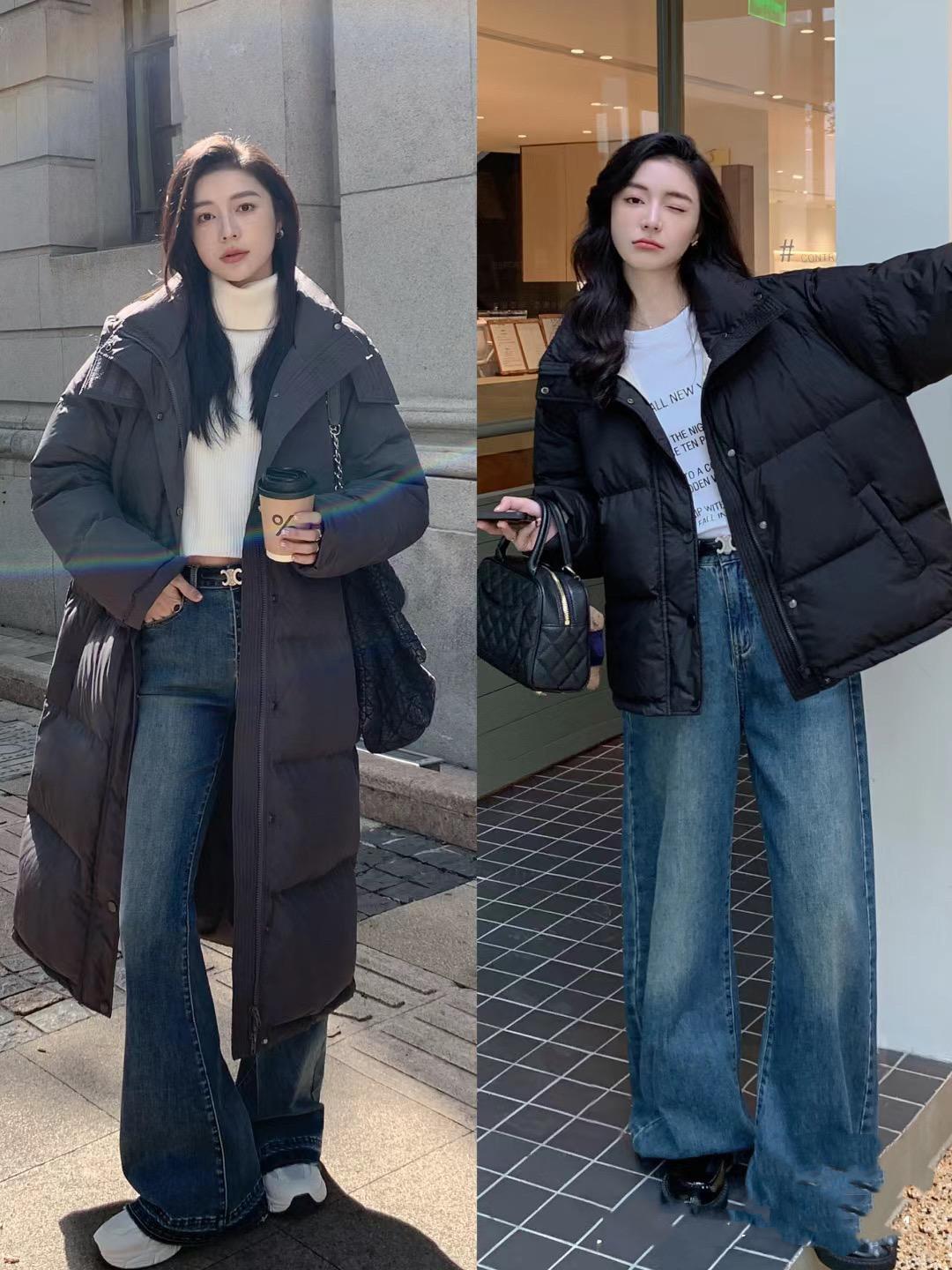 稍微寬鬆的H型羽絨服,可以搭配適當修身的直筒九分褲。修身的直筒九分褲,不僅顯得小腿線條更加筆直,也更加顯瘦。直筒九分牛仔褲,配短靴或者厚底鞋,都很顯高。