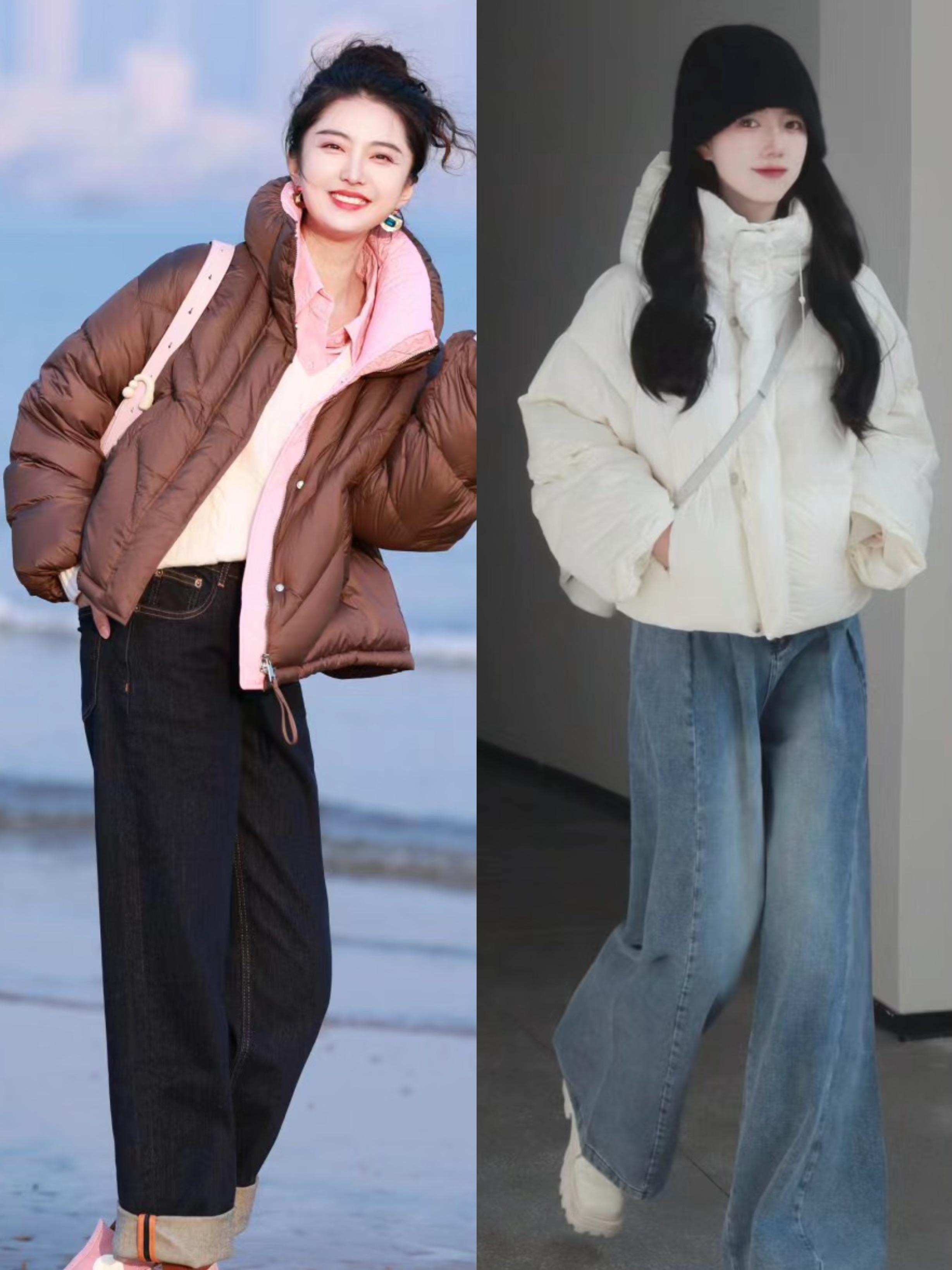 中短款的羽絨服,可以搭配高腰褲來穿着。不管是高腰的牛仔褲、還是高腰的黑色直筒褲,都會更加舒適百搭一點,高腰褲儘量選擇直筒的款式、能拉伸縱向比例顯得個子高挑。
