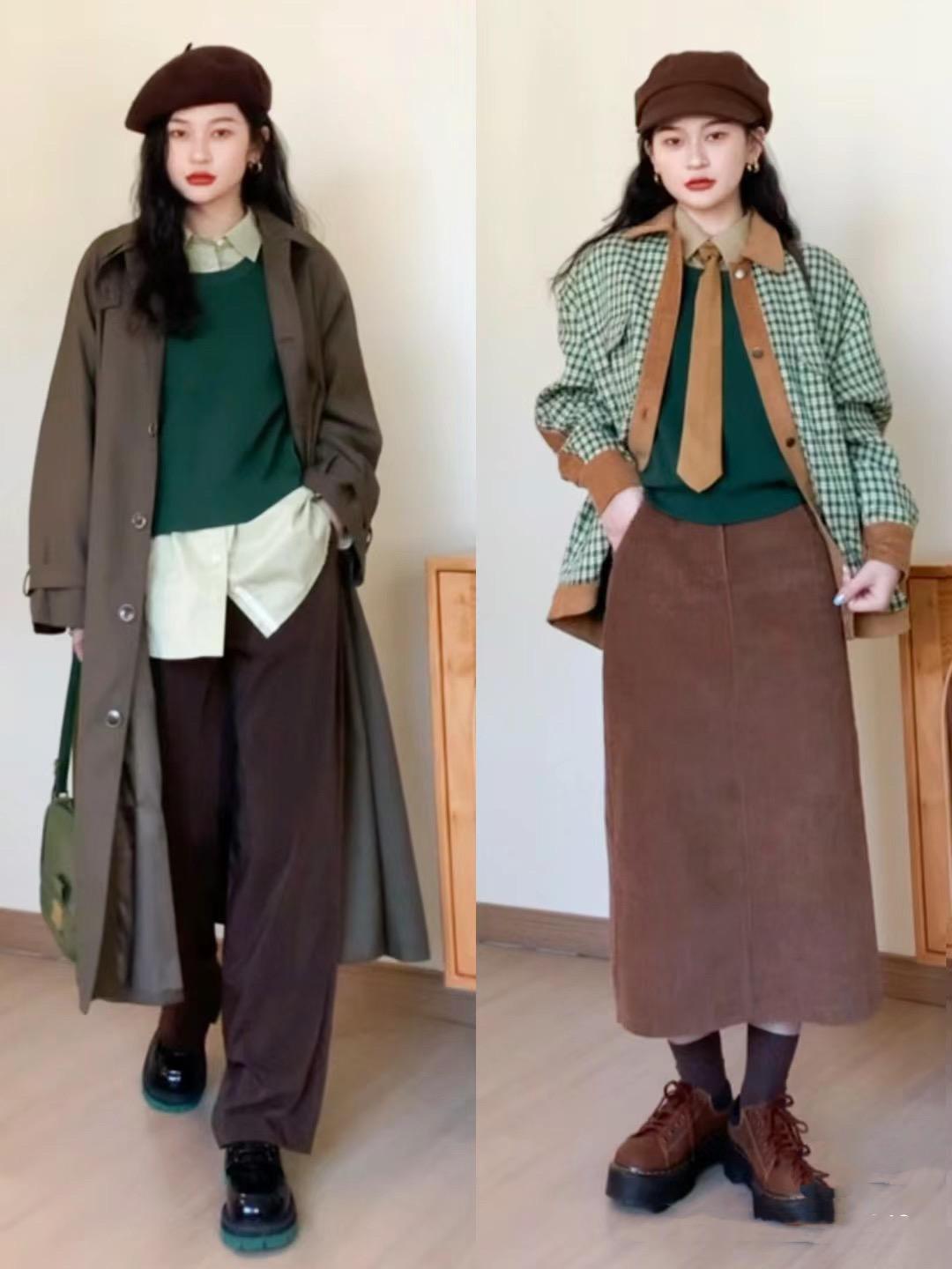 簡單的復古綠針織衫,可以配棕色系的闊腿褲或者半身裙。復古綠是一種很顯白又很高級的顏色,棕色系相對內斂,二者的搭配也更加靜謐顯貴,透着時尚的氣息。