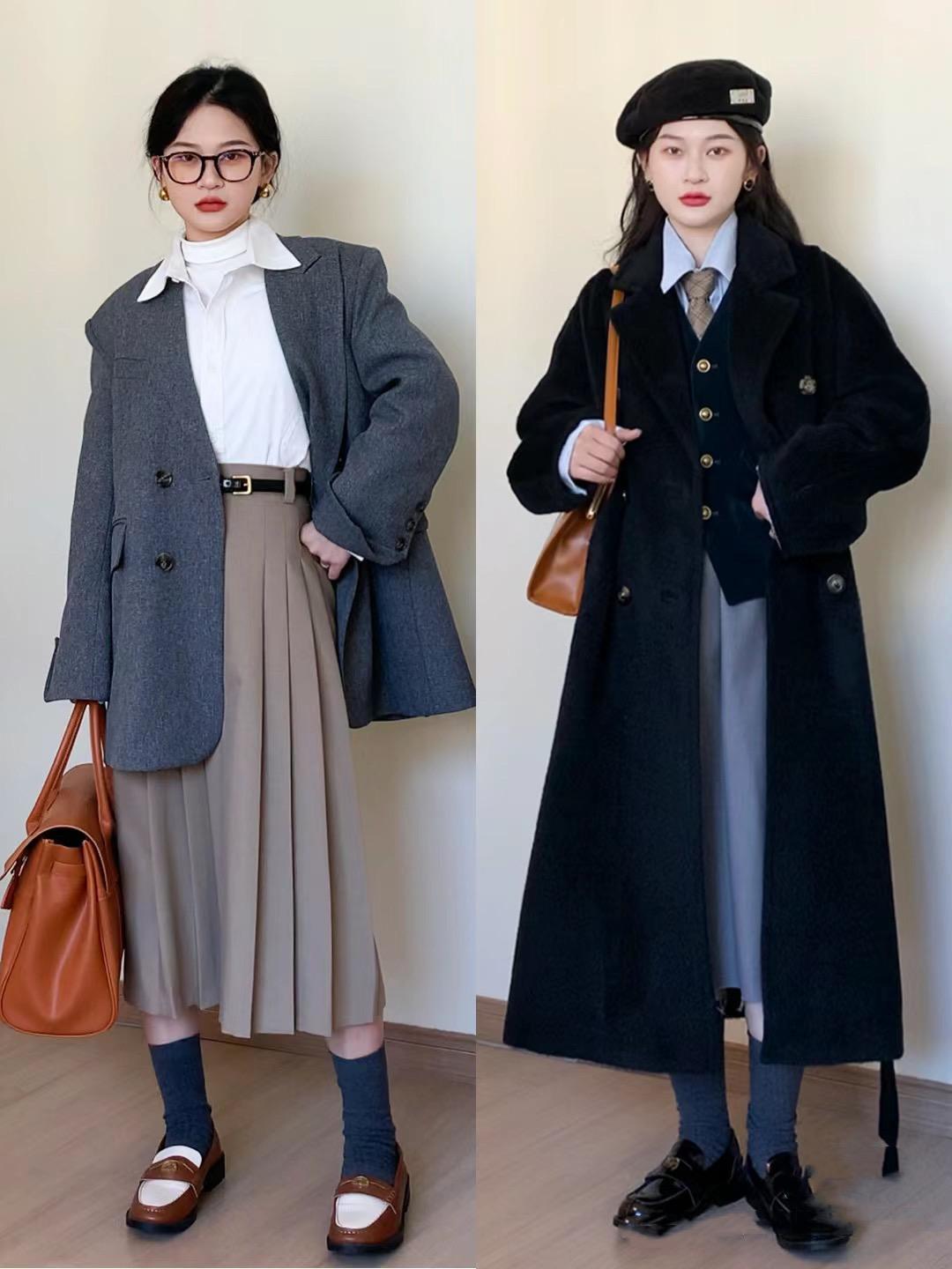 灰色系的毛呢西服外套,有一種自帶的高級美。搭配高腰的百褶半身裙、精緻的撞色小皮鞋、時尚氛圍拉滿。像這種高腰的百褶半身裙,立體打褶的設計,高級又耐看。