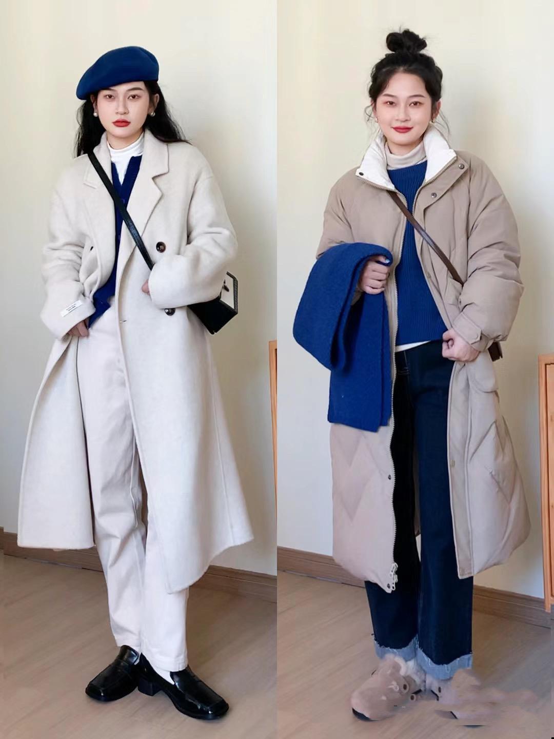 大衣+半高領打底衫+襯衫+直筒的牛仔褲