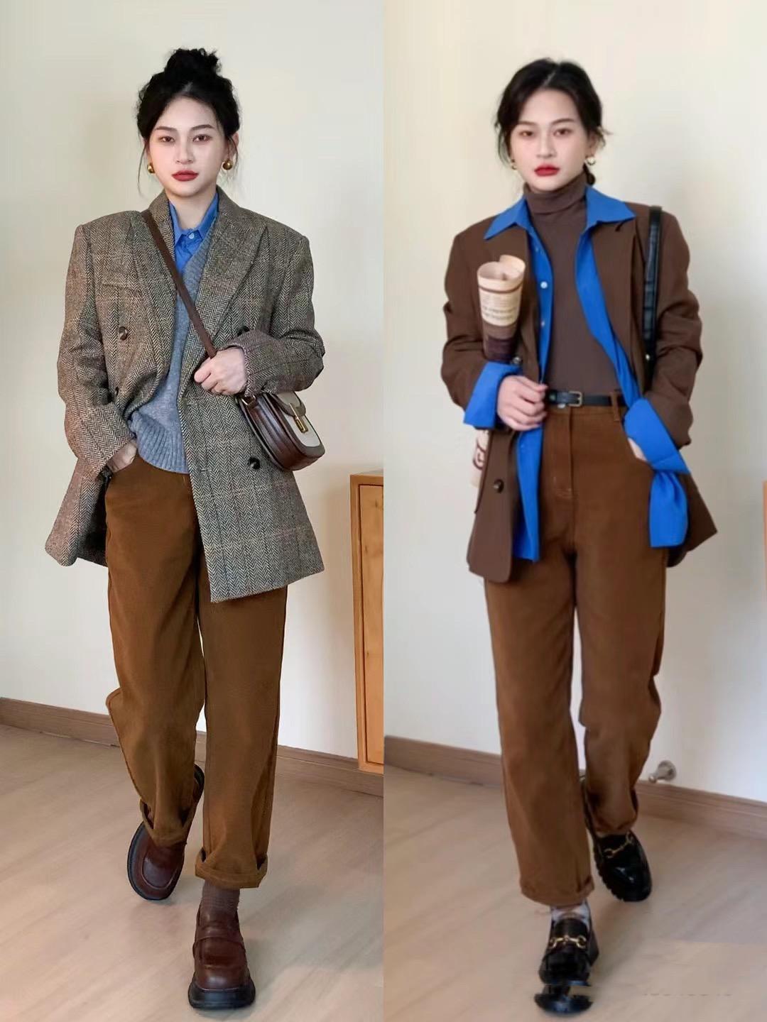 克萊因藍的襯衫,可以搭配棕色系的直筒褲穿着。配棕色西服外套或者復古風格子外套,都有一種很精緻又復古的美。